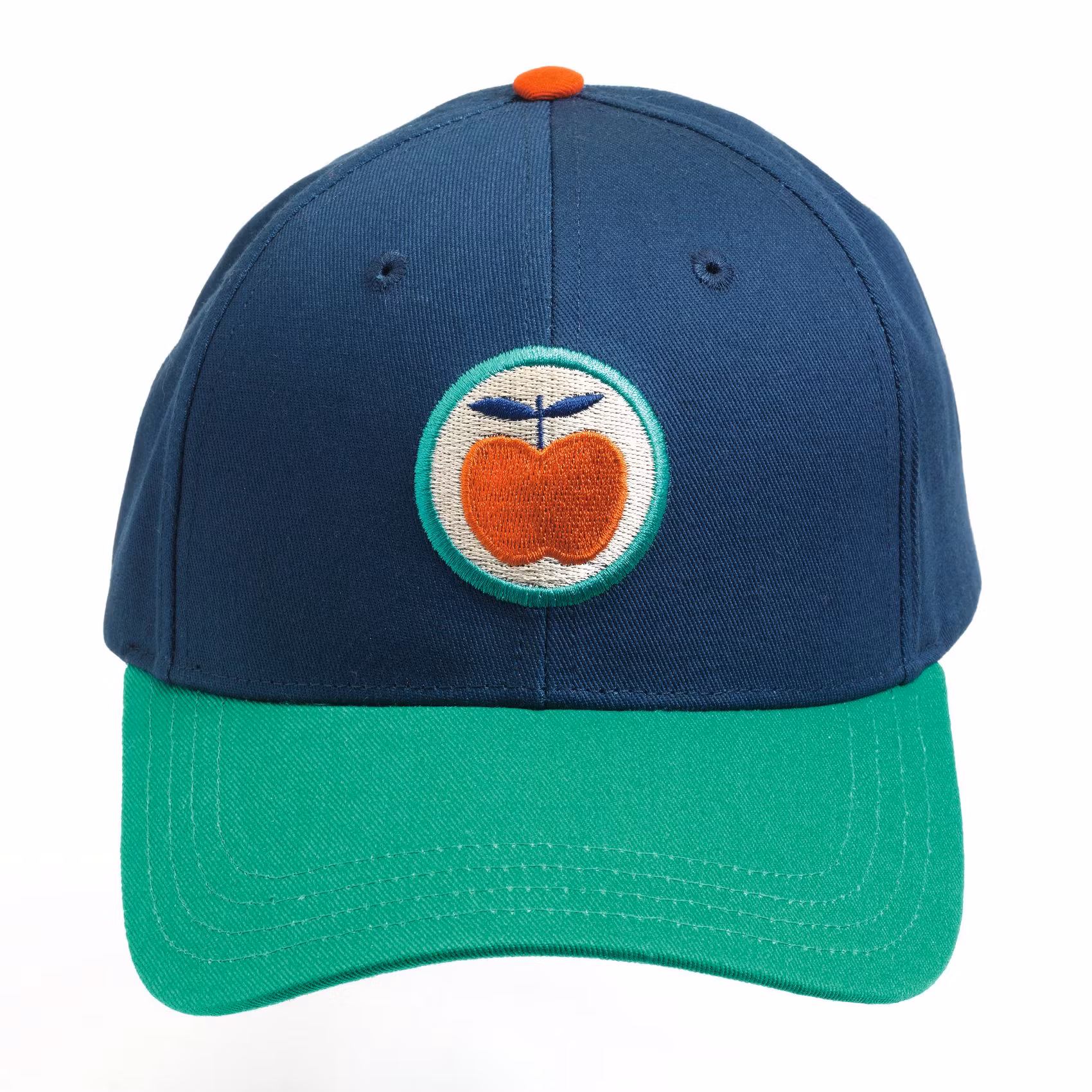 Framsidan pryds av ett broderat märke med ett stiliserat rött äpple och ger den en lite lekfull stil