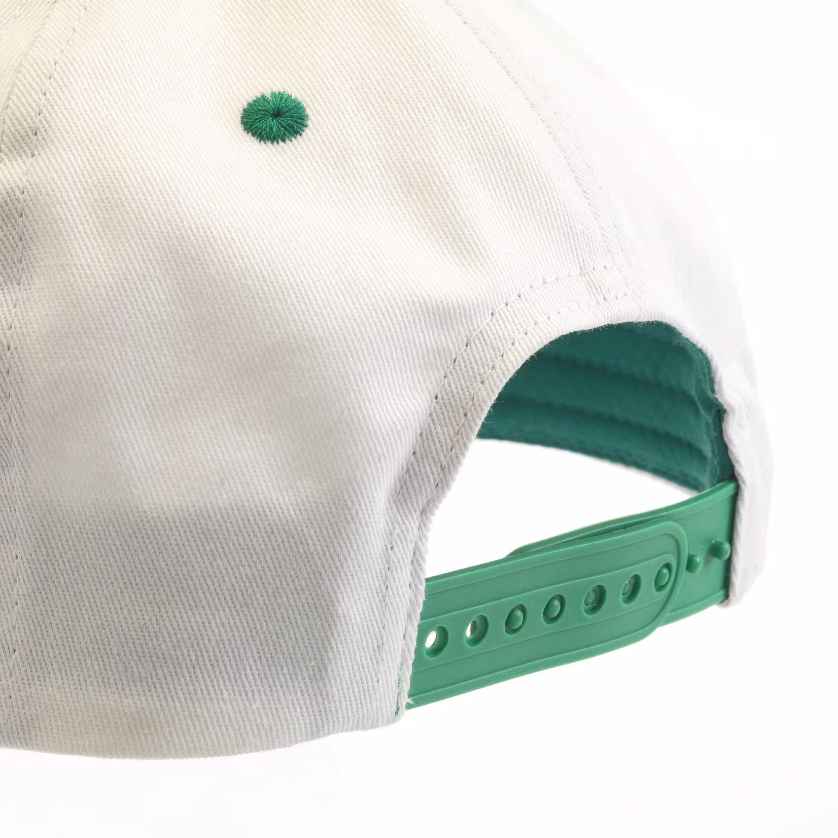 Stil möter funktion i denna barnkeps av bomull i vitt och grönt, vars justerbara storlek säkerställer en bra passform för alla tillfällen och äventyr.