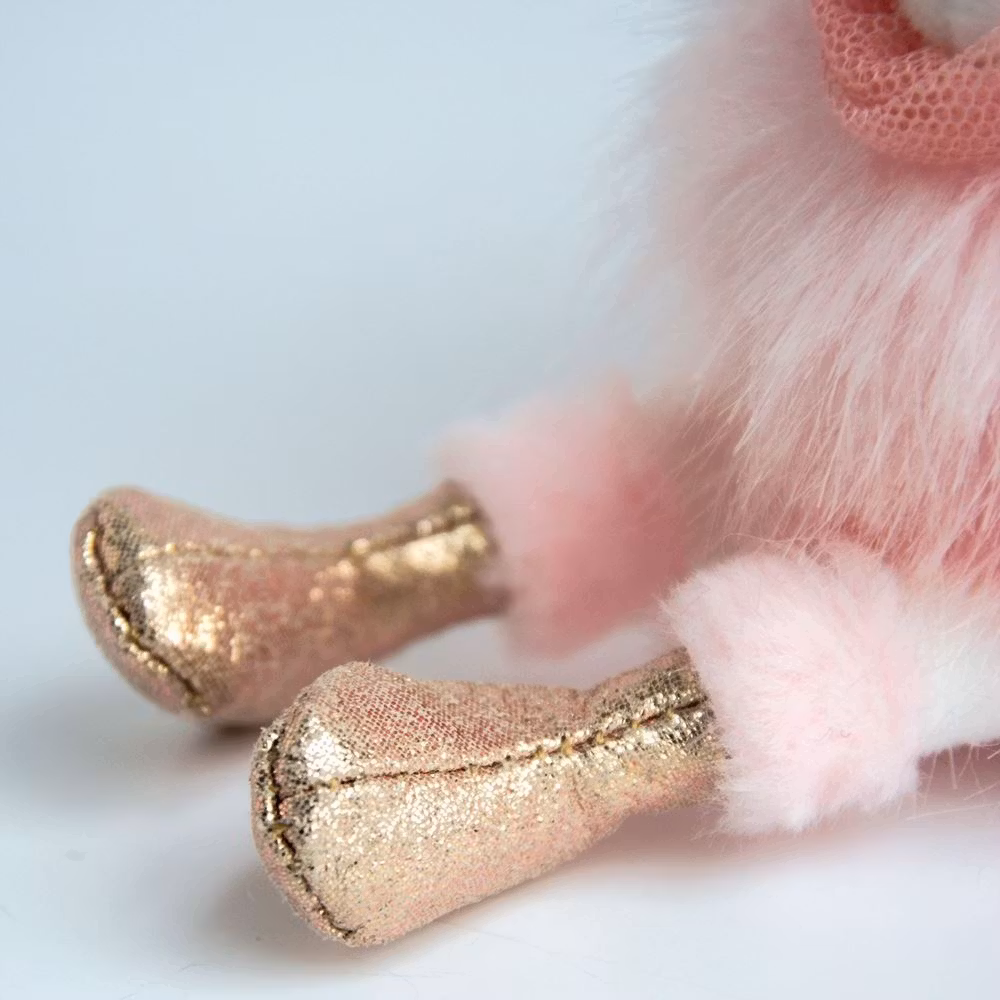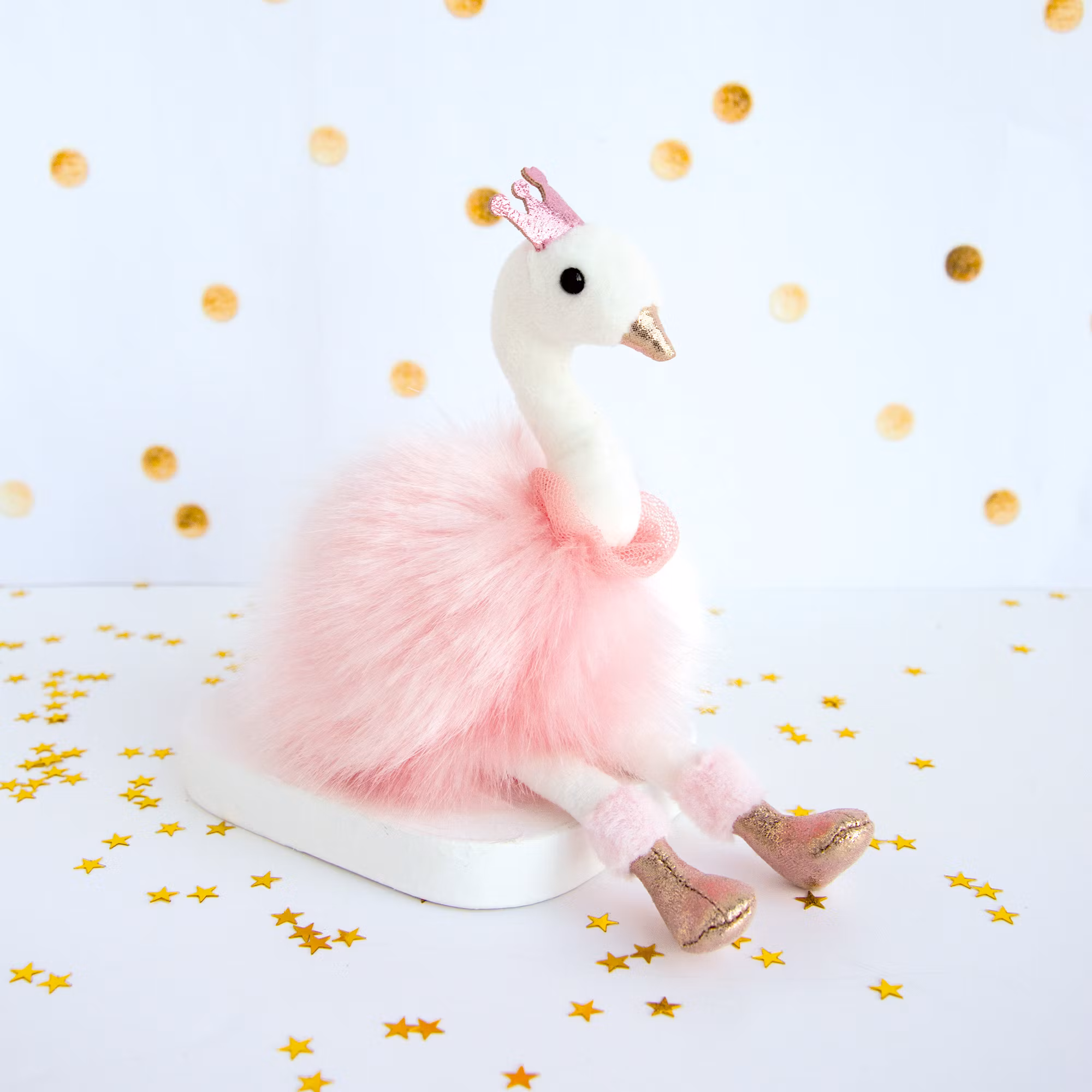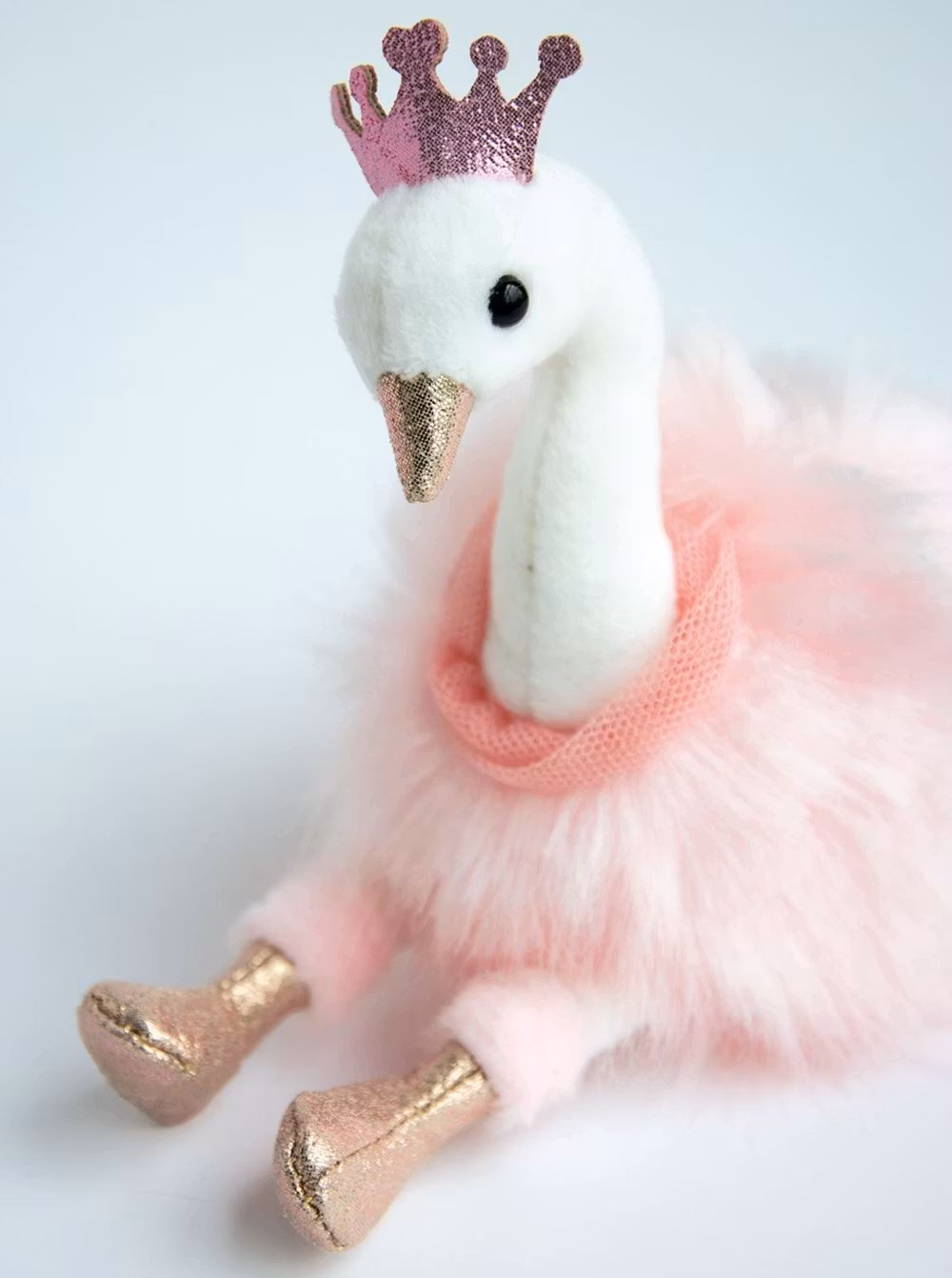 En oemotståndlig vit och pastellrosa svan-nyckelring i mycket fin plyschkvalitet med lång, tät, rosa päls och guldglitter i krona och fötter.