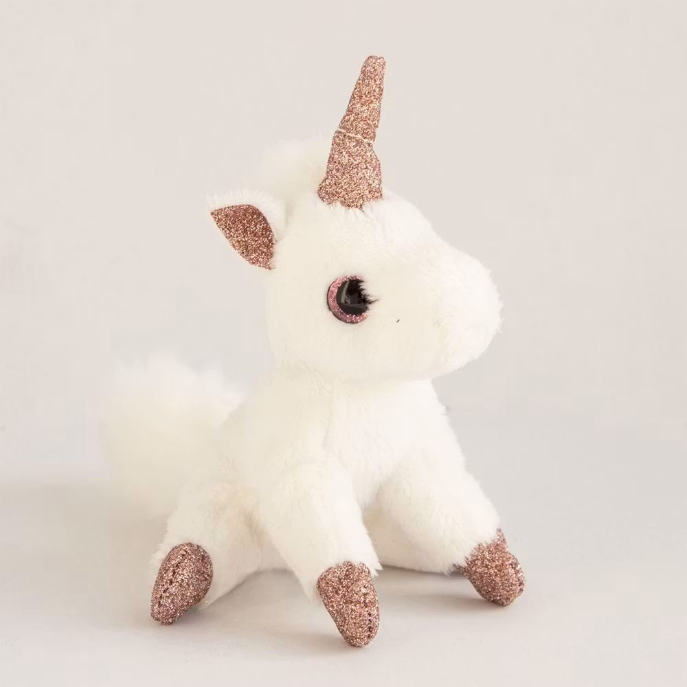 En mycket fin nyckelring med en vit enhörning, som har en mjuk och fluffig vit päls och gnistrande glitterögon.