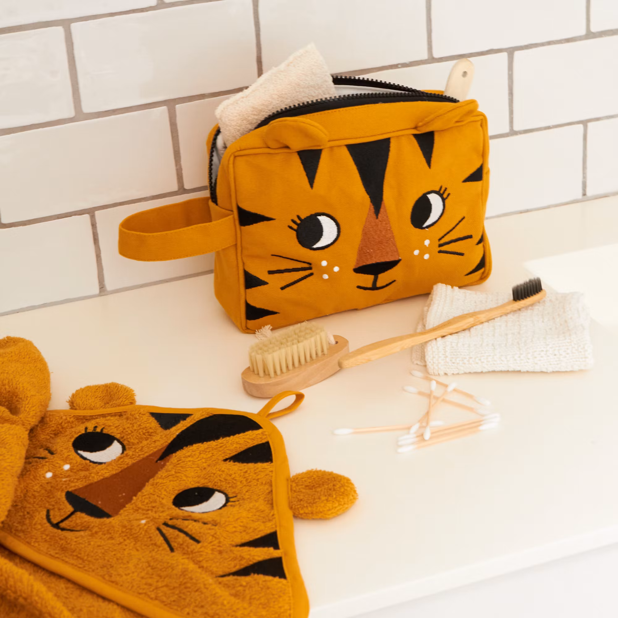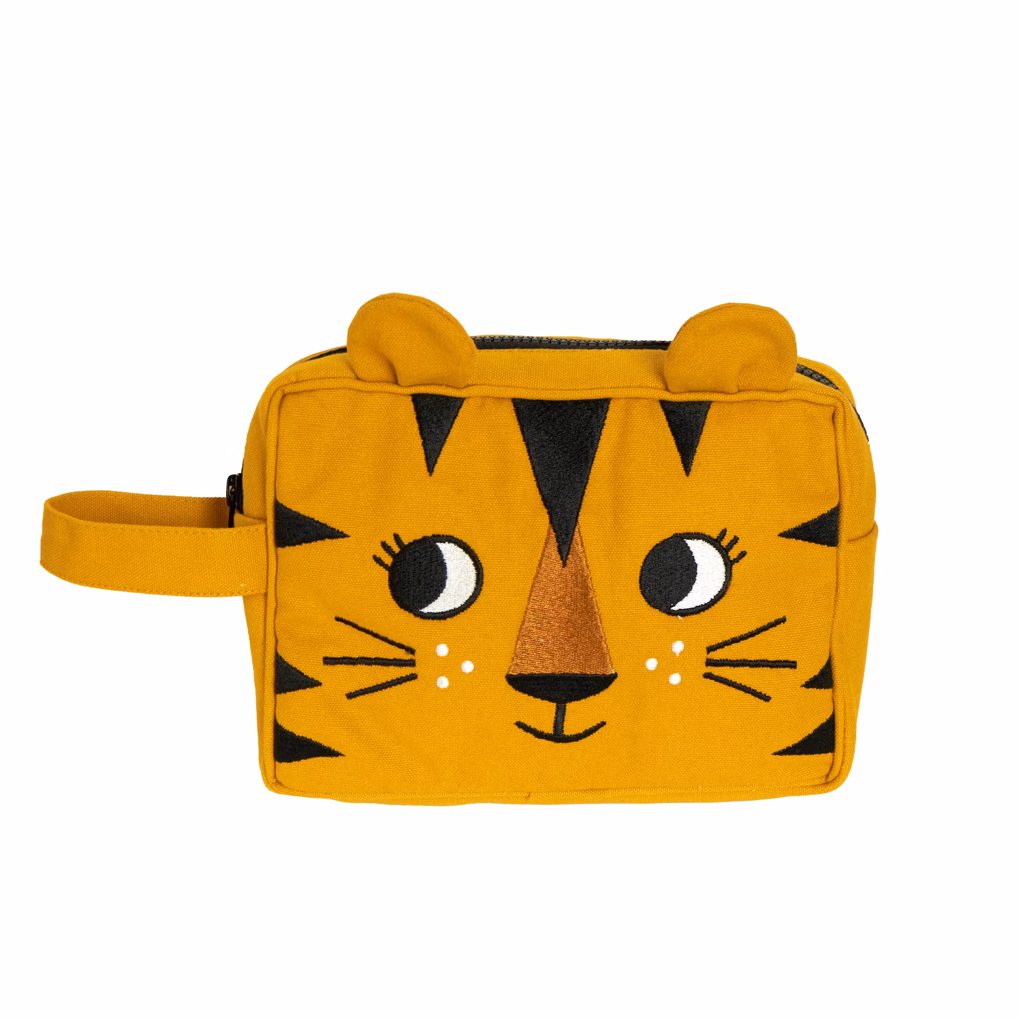 En kul och praktisk ekologisk necessär dekorerad som en tiger med rundade öron som sticker upp ovanför kanten.