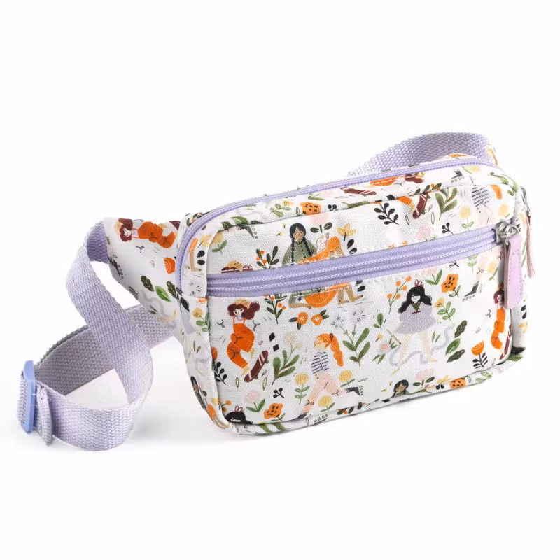 En trendig midjeväska av bomull med ett mönster av tjejer på tyget, försedd med ett stort centralt fack och en mindre ficka fram som båda stängs med dragkedja.