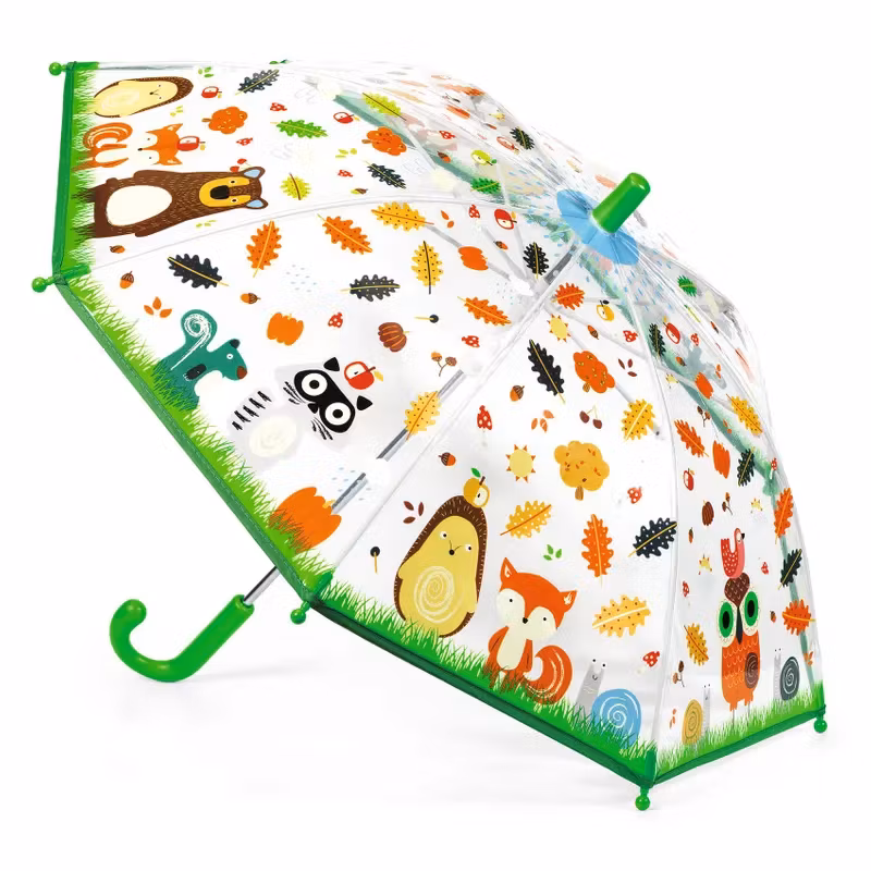Ett fint litet paraply för de mindre barnen, dekorerat med söta bilder av skogens djur, höstlöv, svampar, frön med mera på genomskinlig plast och kantat med ett snyggt grönt tygband.