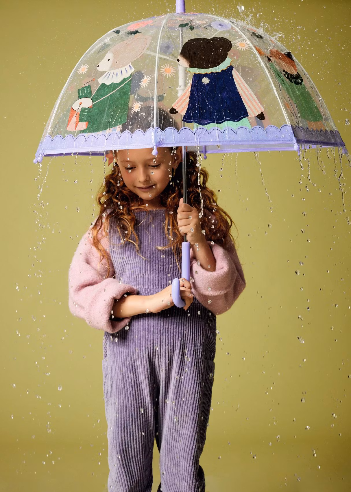 Ett färgglatt paraply i en barnvänlig storlek, illustrerat med bilder på temat djur och musik på genomskinlig plast samt kantat med ett snyggt tyg band. Den delvis genomskinliga designen gör att barnet kan skydda ansiktet mot regnbyar och ändå se skyltar samt vart hen går, medan den manuella öppningsmekanismen med säkerhetssystem säkerställer att även små barn kan öppna och fälla ihop paraplyet utan att riskera klämda fingrar. Ramen med sina åtta ribbor av glasfiber är både lätt och flexibel samt gör att paraplyet tål lite hårdare tag. Paraplyet har också ett praktiskt böjt handtag som gör att man lätt kan hänga upp det när det inte används och små runda knoppar som skyddar ändarna på ribborna så att de inte rivs. En färggrann accessoar som är perfekt att pigga upp regniga promenader med.