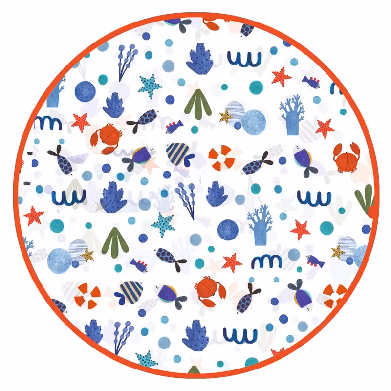 Kappan är dekorerad med färgglada bilder av fiskar och djur från havet samt sjögräs, livbojar med mera.