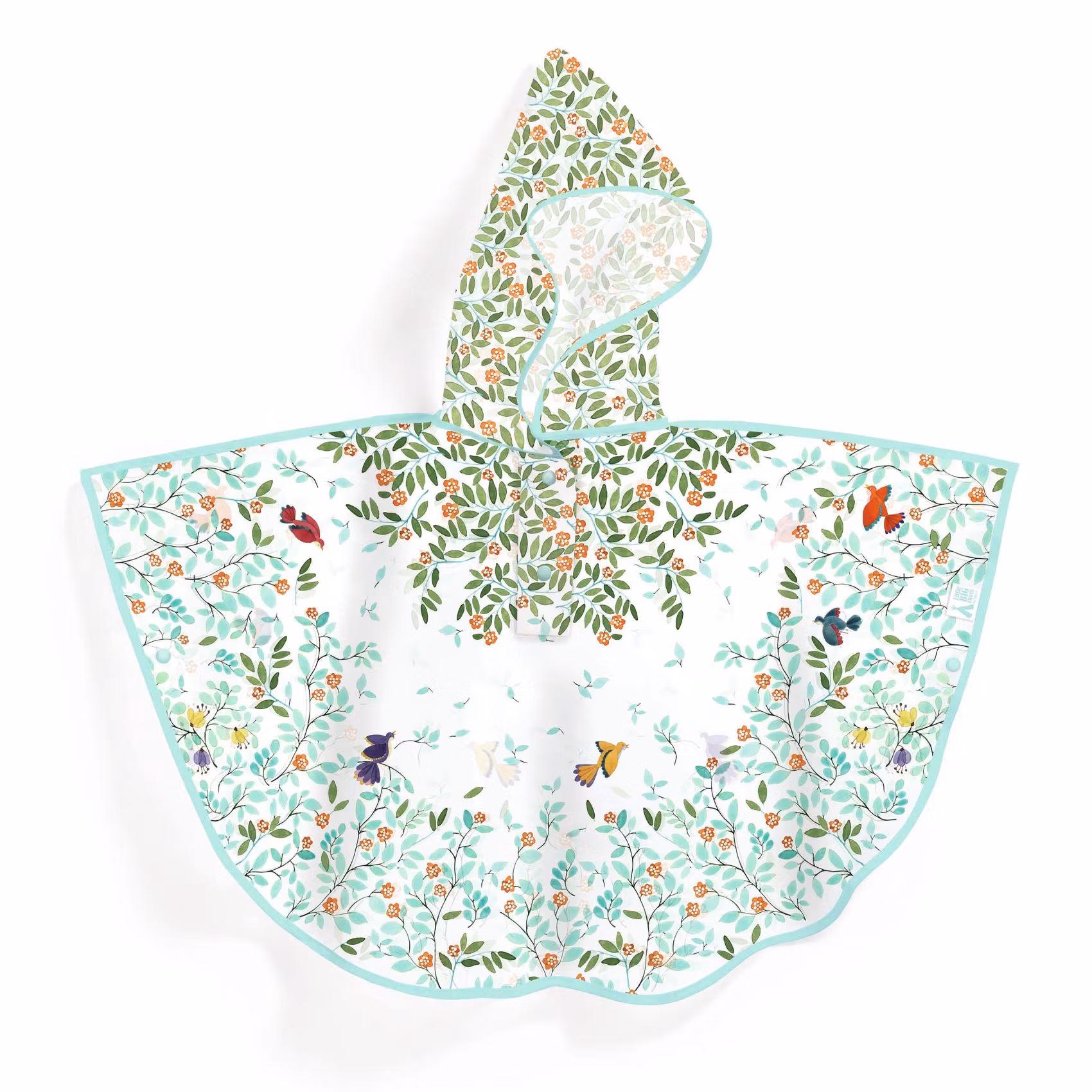 En snygg och praktisk lite större regncape med huva, för barn som är ungefär 110 till 122 cm långa. Kappan är dekorerad med vackra bilder av blommande grenar samt fåglar i glada färger och med en känsla av sen vår. Den är mjuk och smidig, vilket gör den behaglig att ha på sig och röra sig i, dessutom gör tryckknapparna att den är lätt att ta på. Ett perfekt tillbehör för att göra regniga promenader roligare! Tillverkad av halv transparant EVA (Etylen Vinyl Acetat - ett giftfritt, återvinningsbart och förhållandevis mycket miljövänligt termoplastiskt elastomer material) med kantband av polyester och har fyra tryckknappar - två på knappslån i halsen och två i kanten på capen som kan knäppas om handlederna. Designen matchar den på paraplyet Flowers and Birds (artikelnummer DD04804).