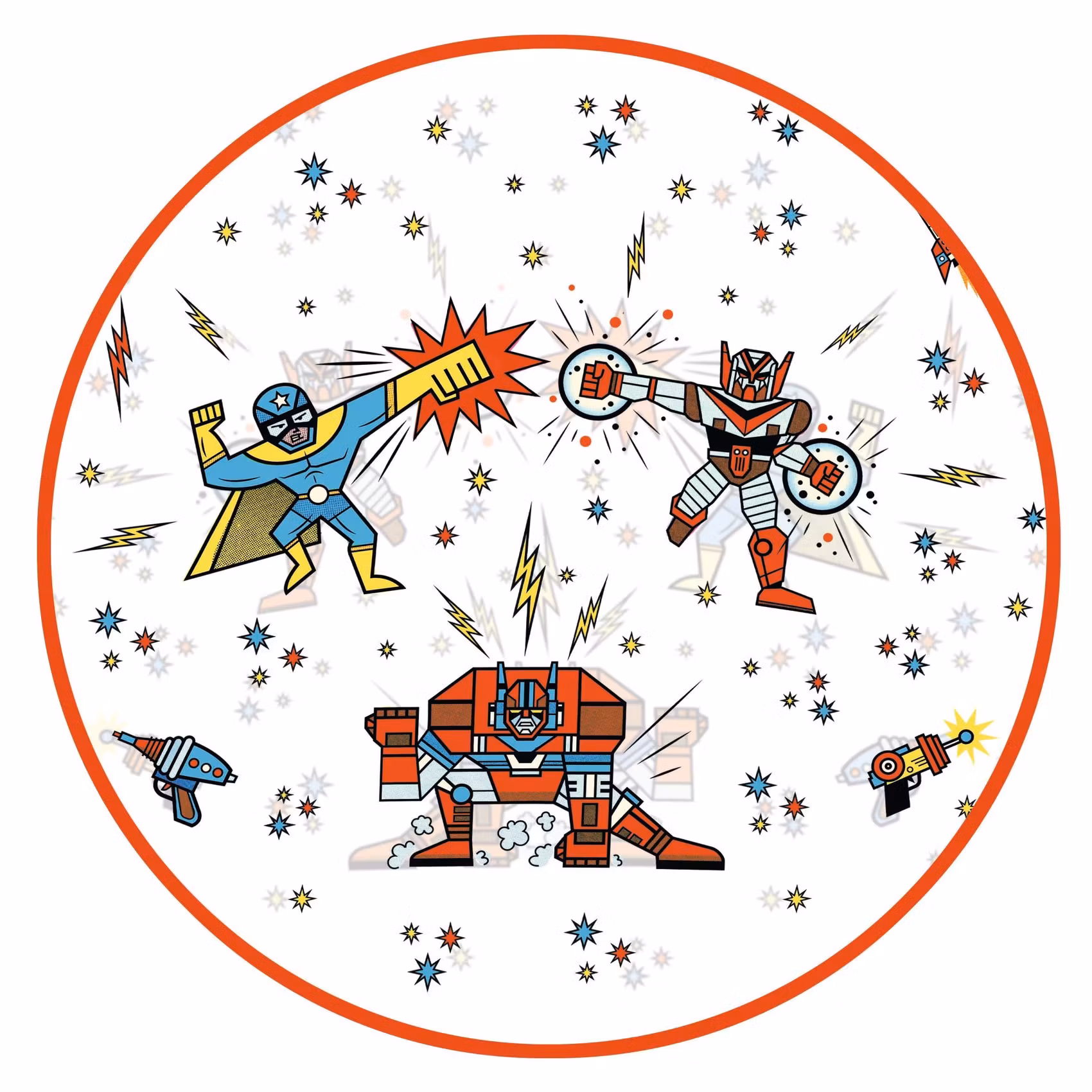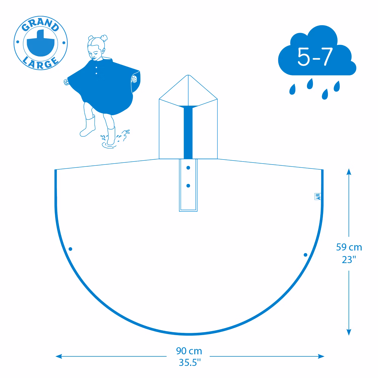 Superhjältar är inte rädda för lite regn! En snygg och praktisk lite större regncape med huva, för barn som är ungefär 110 till 122 cm långa. Kappan är dekorerad med häftiga bilder av superhjältar, skurkar, kometer, raketer med mera i glada färger och med en känsla av action. Den är mjuk och smidig, vilket gör den behaglig att ha på sig och röra sig i, dessutom gör tryckknapparna att den är lätt att ta på. Ett perfekt tillbehör för att göra regniga promenader roligare! Tillverkad av halv transparant EVA (Etylen Vinyl Acetat - ett giftfritt, återvinningsbart och förhållandevis mycket miljövänligt termoplastiskt elastomer material) med kantband av polyester och har fyra tryckknappar - två på knappslån i halsen och två i kanten på capen som kan knäppas om handlederna.