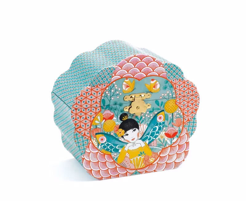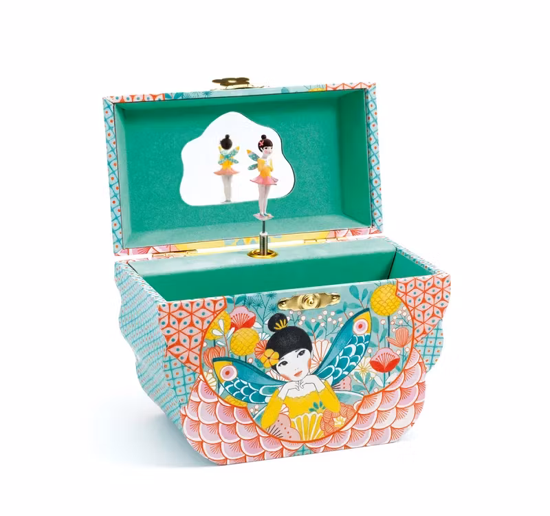 Fint smyckeskrin och speldosa formad som en blomma i fina färger där en älva dansar framför en spegel formad som ett moln när du drar upp mekanismen och öppnar locket.