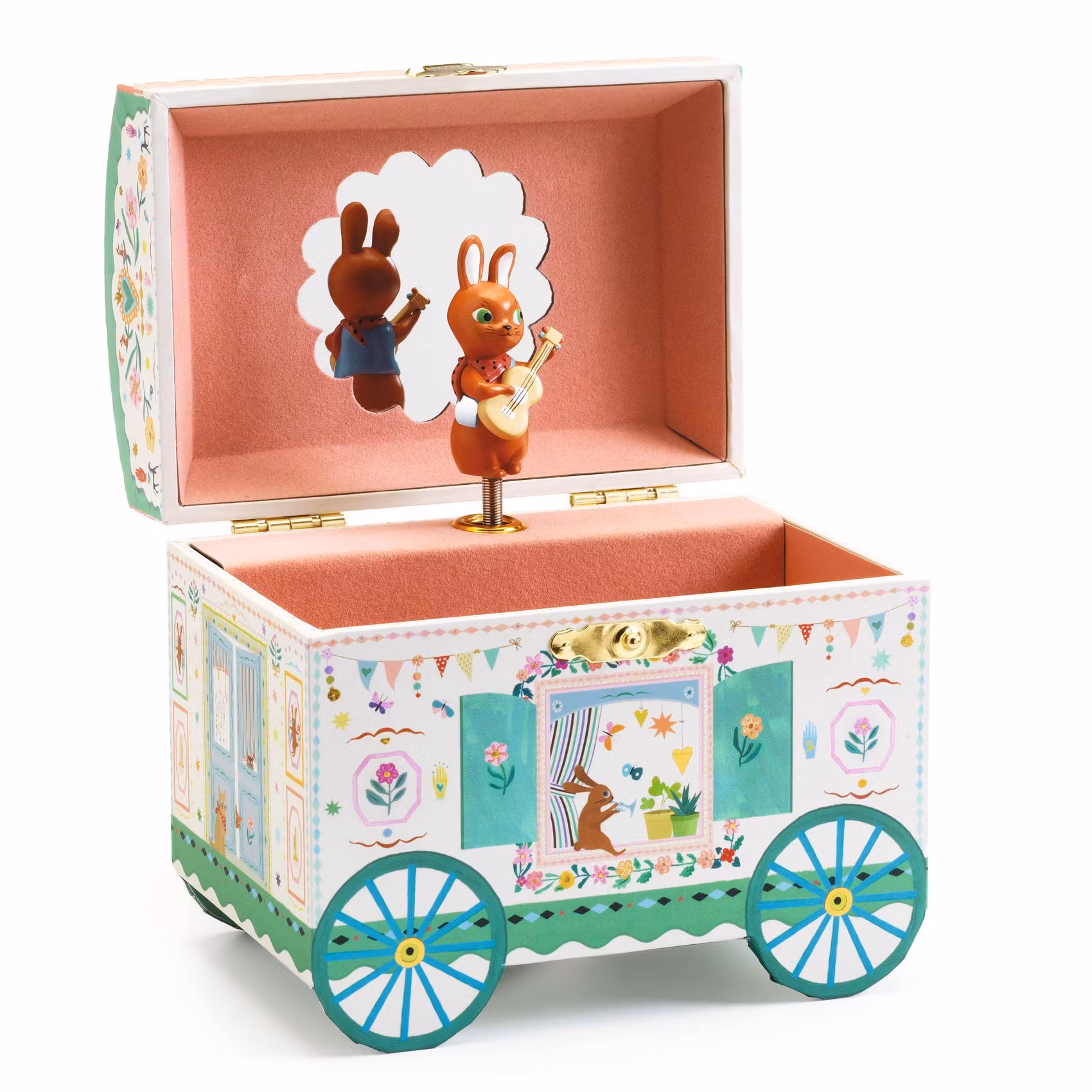 Ett vackert illustrerat kombinerat smyckeskrin och speldosa som är perfekt att förvara smycken eller hemligheter i och är formad som en charmig gammaldags husvagn.