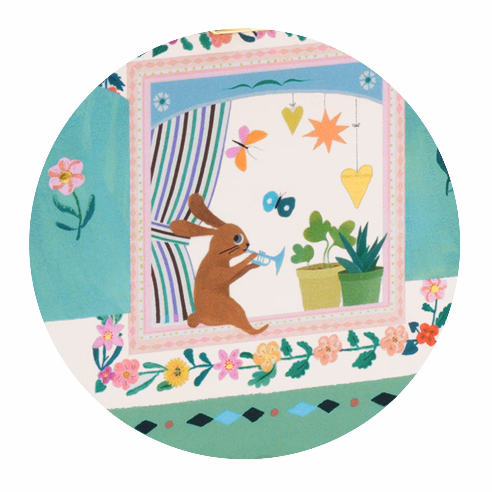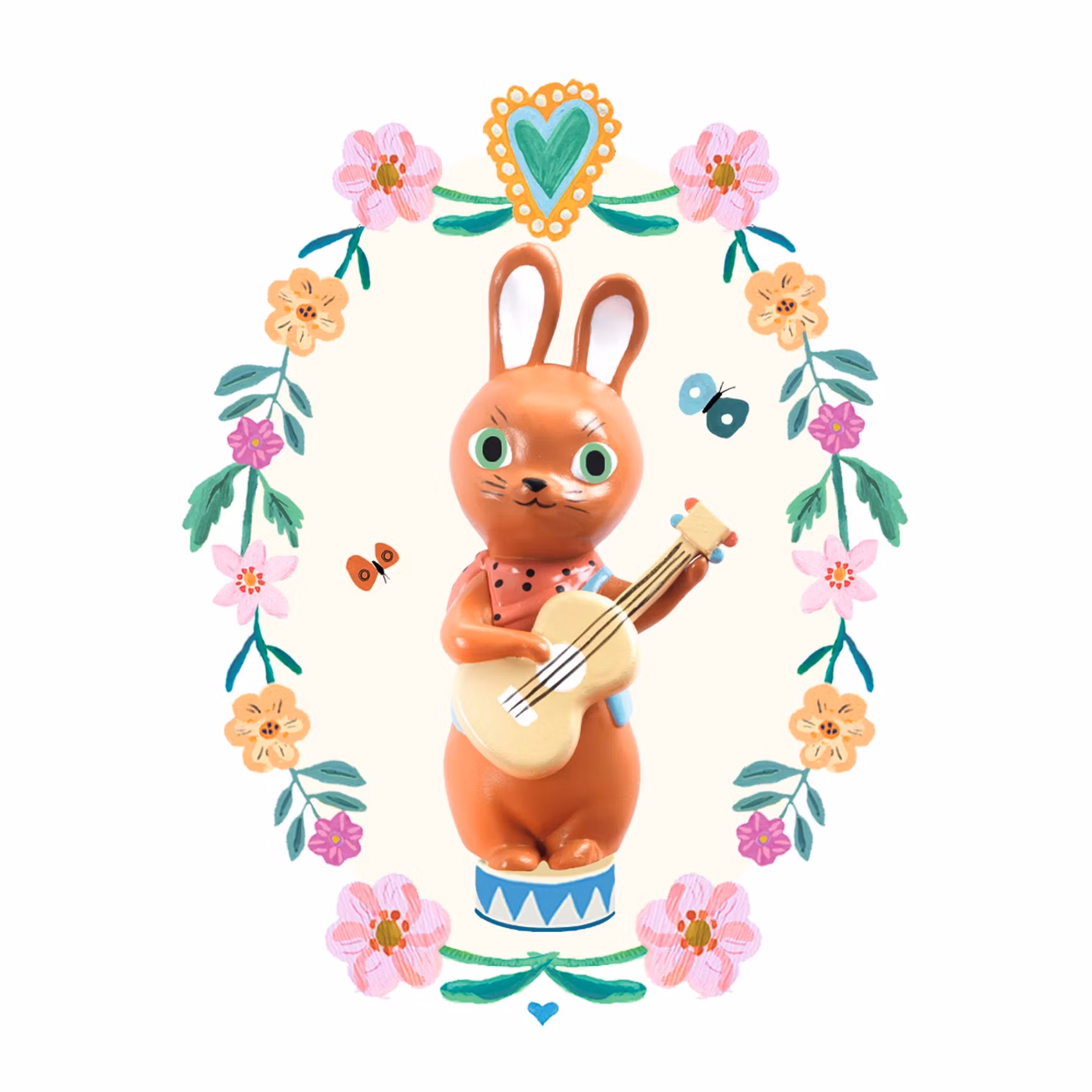 När du vrider upp mekanismen med hjälp av den lilla nyckeln på baksidan och öppnar locket får du se en vackert snidad kanin med en gitarr i famnen som snurrar runt framför en liten formad spegel till Antoine Ronzons melodi “Le temps des cerises” (The Time of Cherries) i upp till 2 och en halv minut.