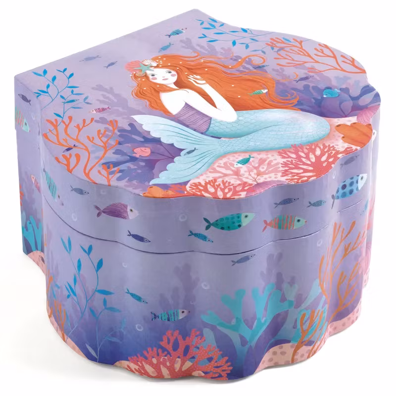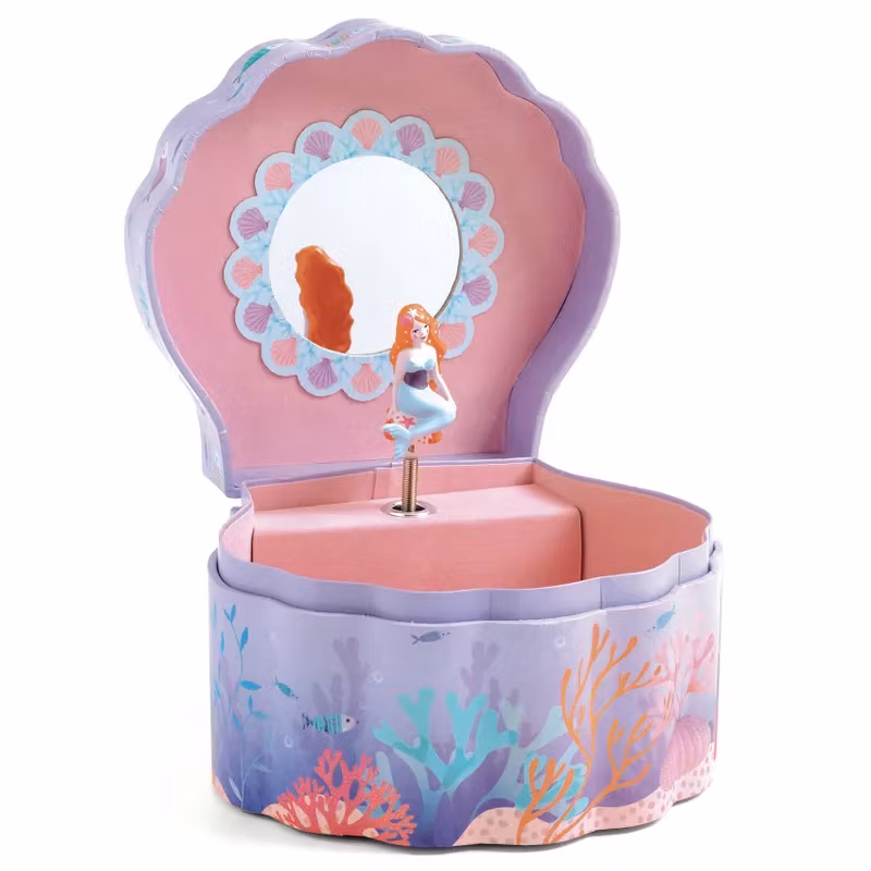 Ett snyggt smyckeskrin format som en lila snäcka med en sjöjungfru på och en liten sjöjungfru som snurrar runt till en melodi när någon öppnar skrinet.