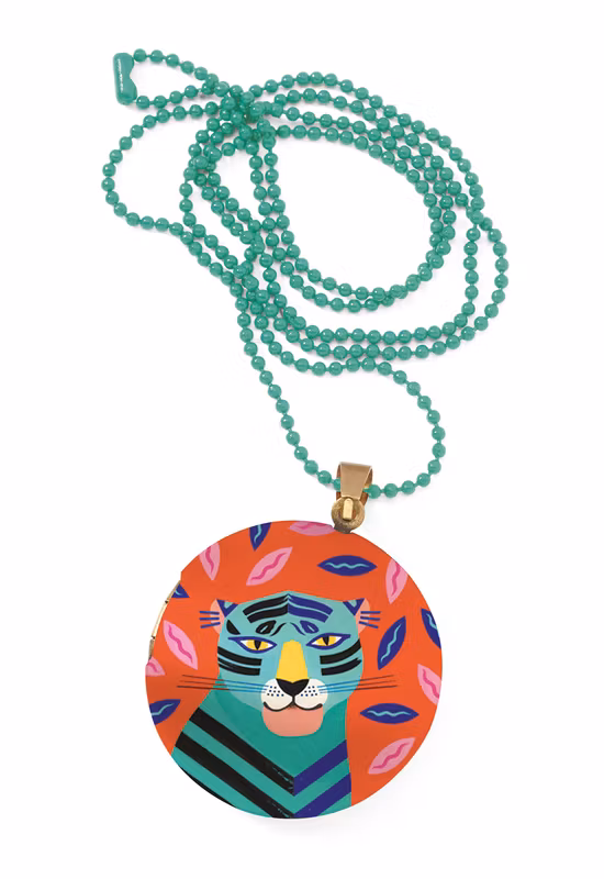 Fint halsband med öppningsbart hänge. Motiv: Häftig tiger. Hängets storlek är ca Ø 2,7 cm i diameter. Kedjan är tillverkad i metall och färgad i matchande färg till hänget. Kedjans längd är ca 55 cm.