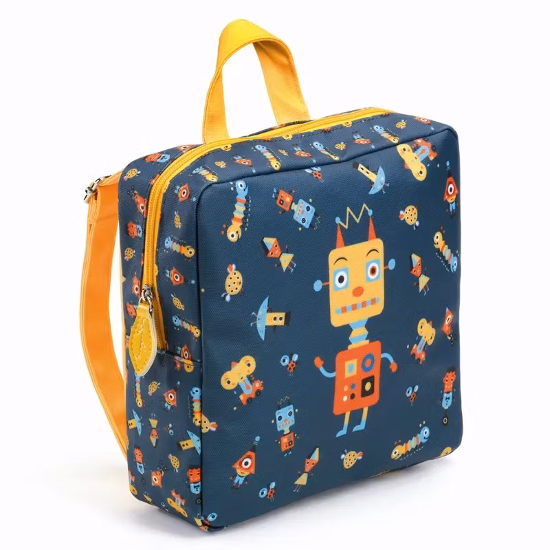Tryckta robotmotiv som dekoration. Väskan är tillverkad i fodrad canvas, har reglerbara axelremmar och handtag överst på väskan.