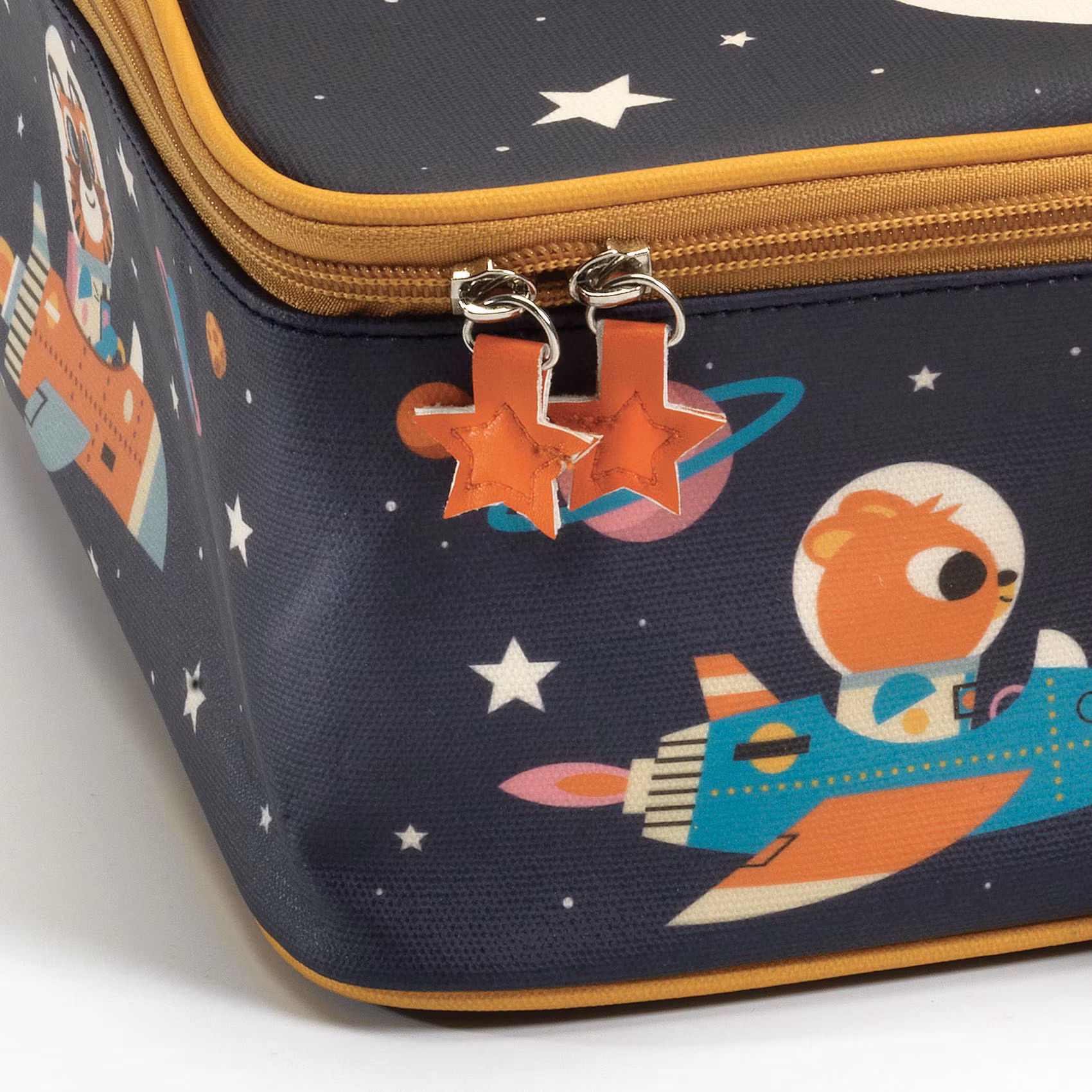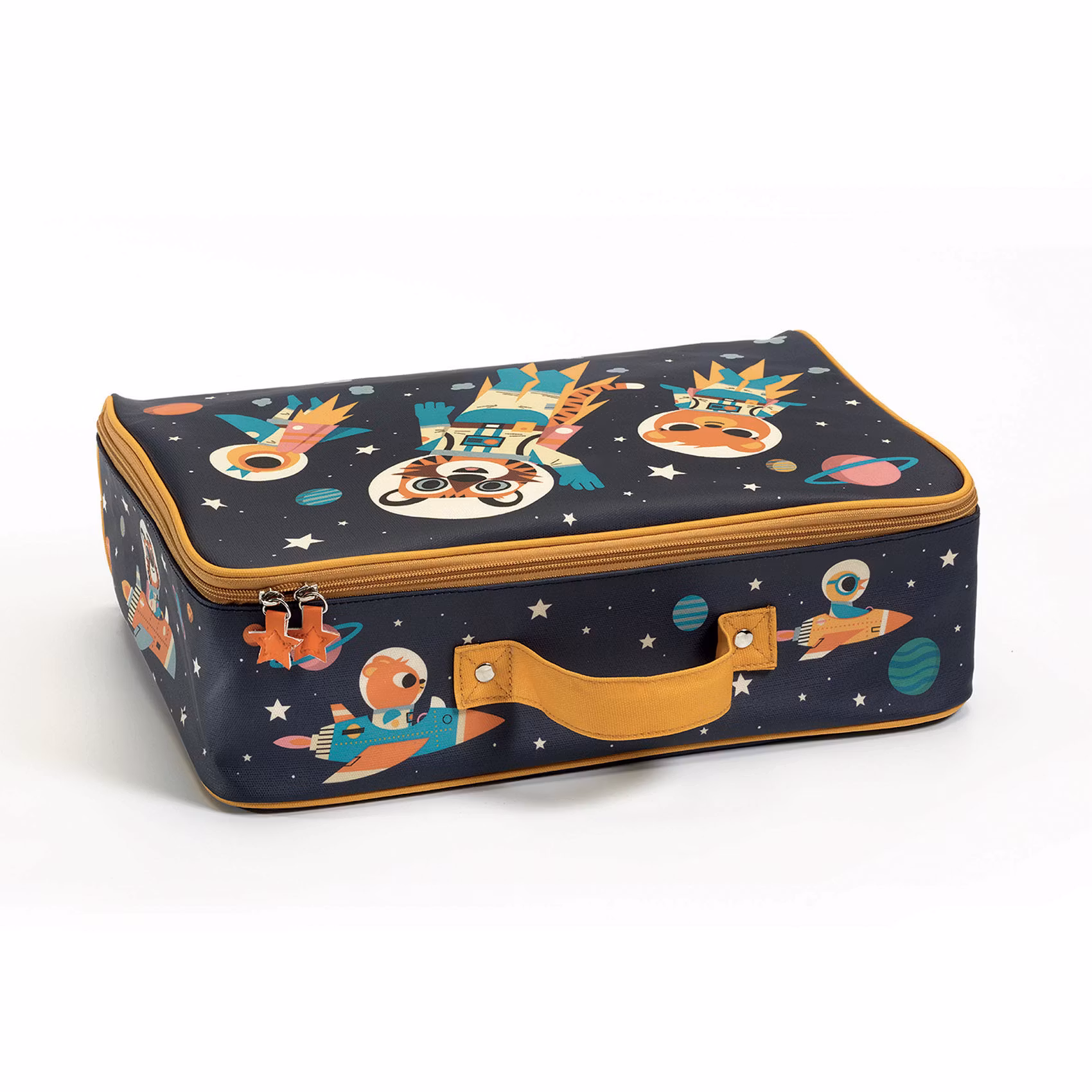 En lätt resväska (ca 660 g) vackert dekorerad med en bild från rymden i klara färger där astronauter med jet-packs flyger mellan stjärnor och planeter. Detta är en snygg och vattentät resväska som gör det enklare att ha leksaker och annat i närheten när man är hemifrån, eller för packningen när du ska resa bort över helgen. På insidan har väskan ett stort fack med två mindre fickor för småsaker och locket stängs med ett dubbelvägs-blixtlås som har två snygga hankar i form av stjärnor att dra i. Väskan är av tyg med en stel inre konstruktion som skyddar dina saker när du använder den och som kan fällas ihop när väskan inte används, samt ett handtag som är både fastnitat och fastsytt. Yttertyget är av plast-laminerad bomulls kanvas, innertyget är av 80% bomull samt 20% polyester och utsidan kan tvättas av med vatten. Designen matchar den på necessären/pennskrinet "Cases Direction space" (DD00284).