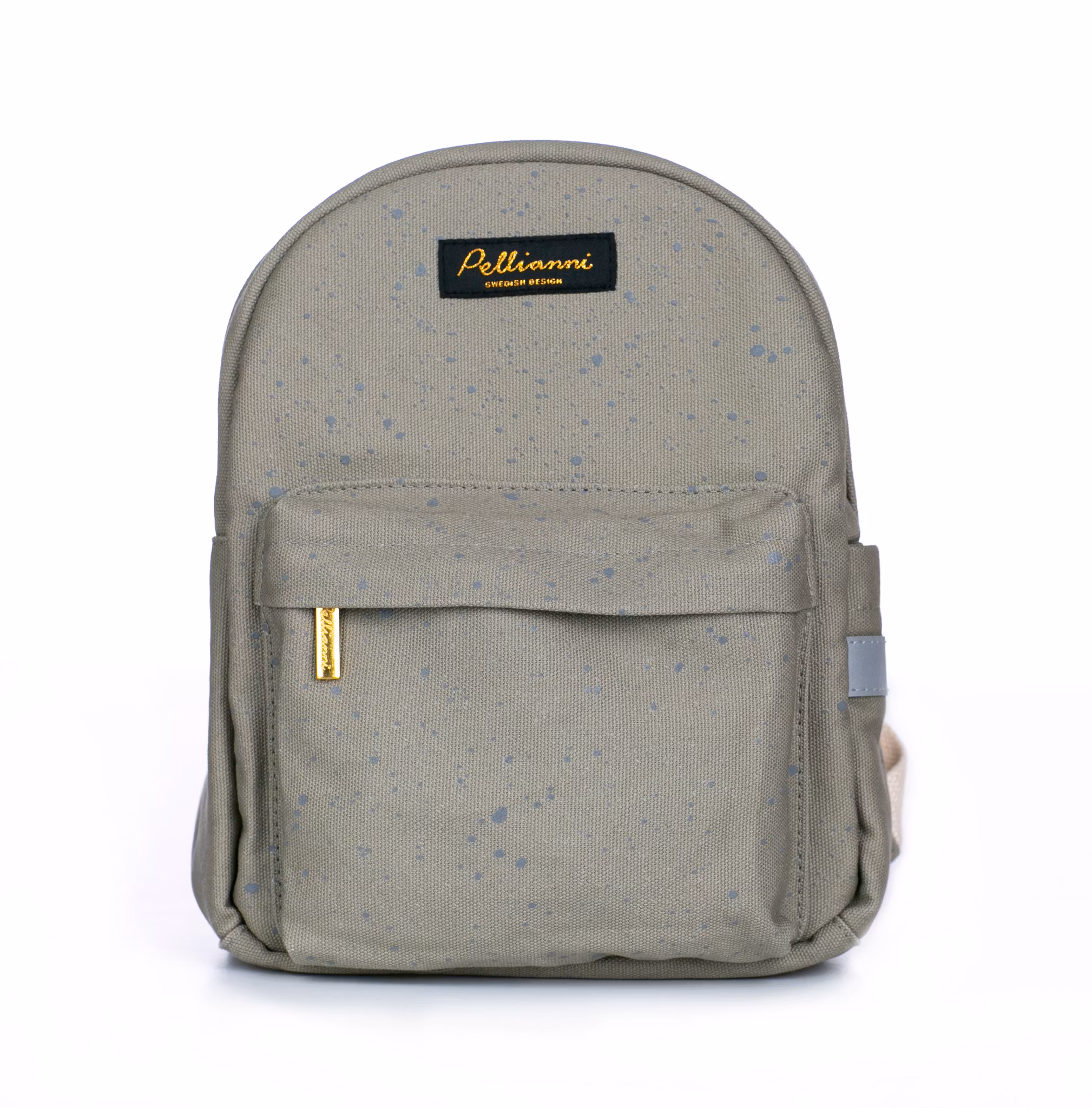 Denna fina ryggsäck för barn är vegansk samt tillverkad av ekologisk och miljövänligt tillverkad bomullscanvas i olivgrönt med ett kul stänkt mönster. På insidan finns det förutom det stora facket en praktisk ficka med dragkedja, en namntagg där du kan skriva ditt namn och en specialsydd ficka för en liten flaska eller termos. På utsidan finns det en ytterficka med dragkedja och en sidoficka. Alla blixtlås har en snygg guldfärgad dragare som ger väskan en lite elegantare framtoning. Ryggsäcken är vadderad för att bli extra bekväm och har justerbara axelremmar samt ett rem med klickspänne som spänns tvärs över bröstkorgen för att hålla väskan på plats. Väskans tyg är tryckt med ett reflekterande mönster och har reflexband fastsydda på väskans båda kortsidor, så ryggsäcken syns bra i mörkret och bilister upptäcker barnet lättare.
