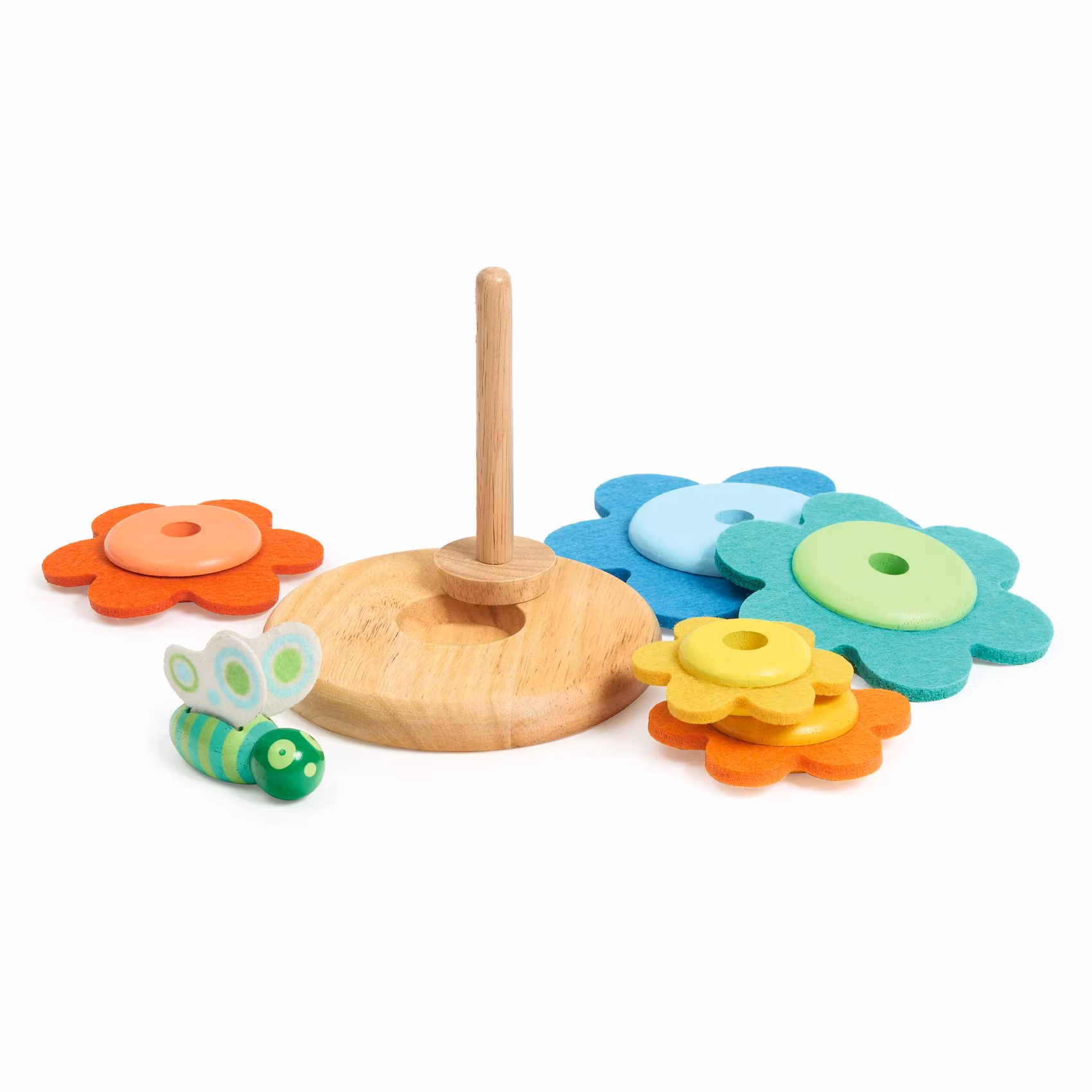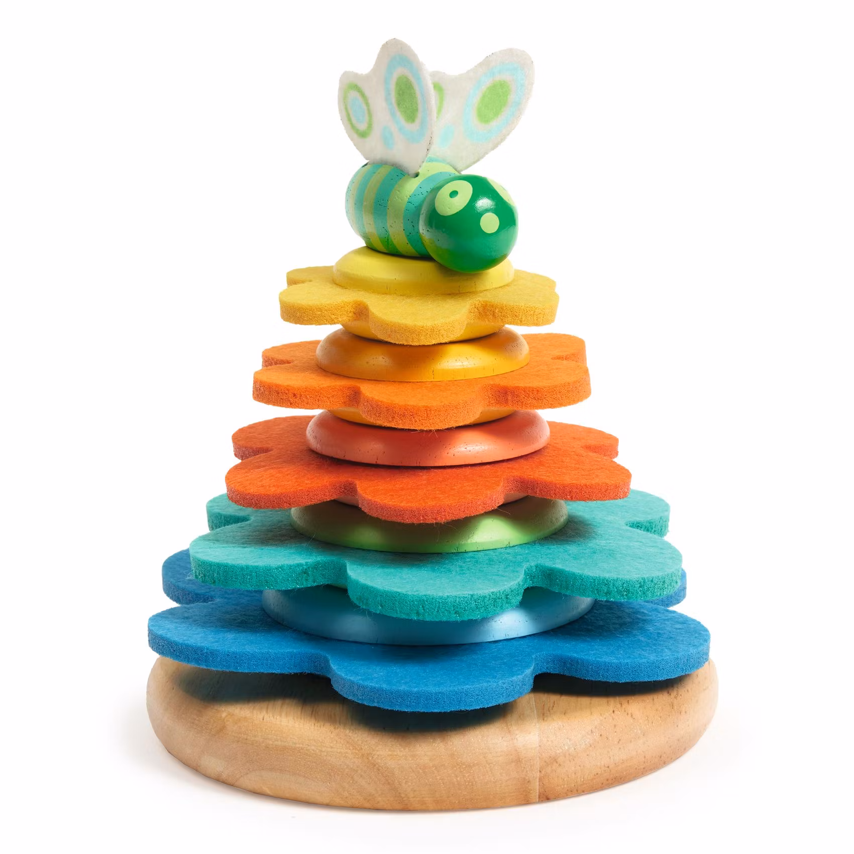 En vacker och färgglad stapelleksak av trä och filt där barnet kan stapla de blom-formade ringarna från störst till minst och avsluta pyramiden med fjärilen.