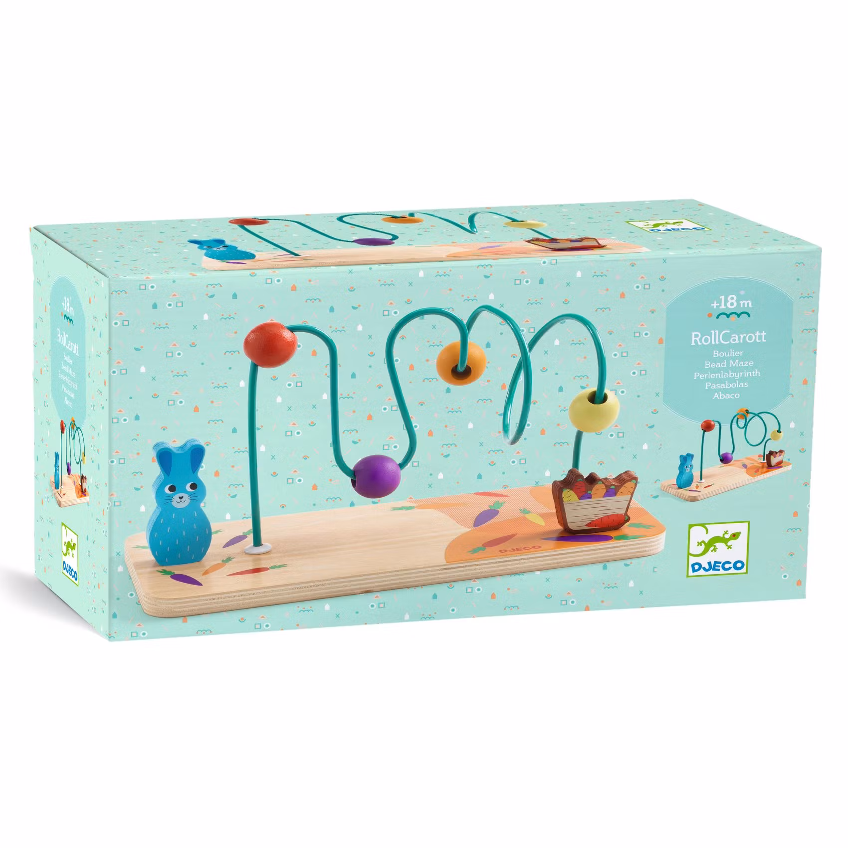 Barnet kan ha kul med att glida och vrida de färgglada kulorna upp och ner längs stången, vilket gör att kaninen kan kopplas till sina morötter.