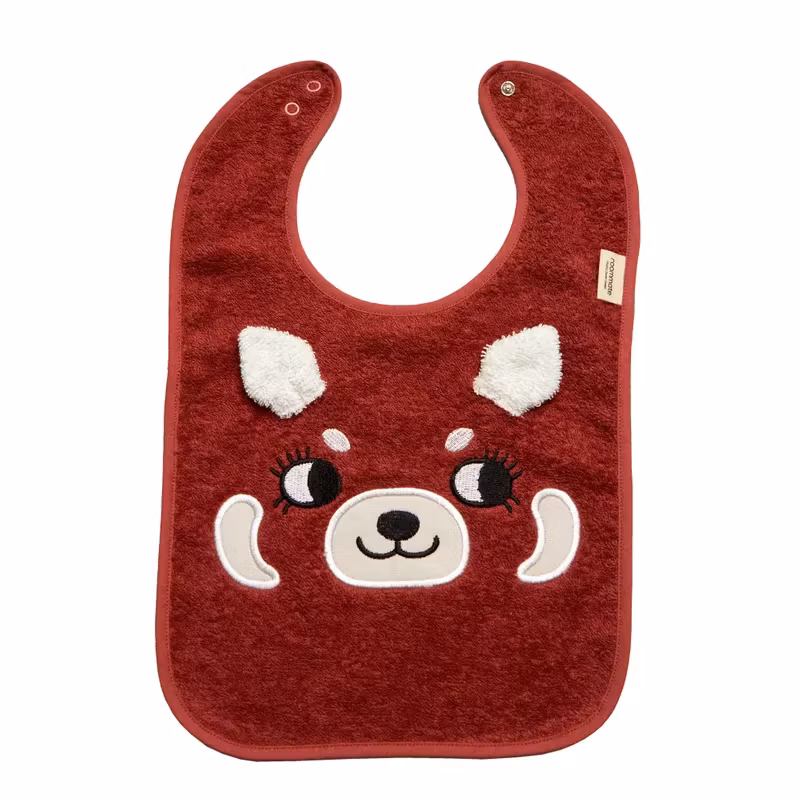 En söt ekologisk och GOTS-certifierad haklapp dekorerad som en röd panda, med applicerade vita fläckar och ett broderat ansikte mitt på haklappen och små öron i frotté fastsydda på sidorna. Haklappen stängs med en tryckknapp baktill.