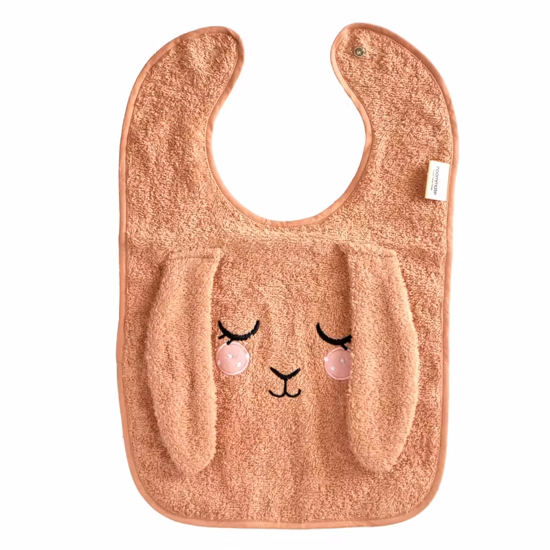 En söt ekologisk och GOTS-certifierad haklapp i form av en gammelrosa kanin, med ett blundande kaninansikte broderat mitt på och långa, hängande öron i frotté på sidorna.