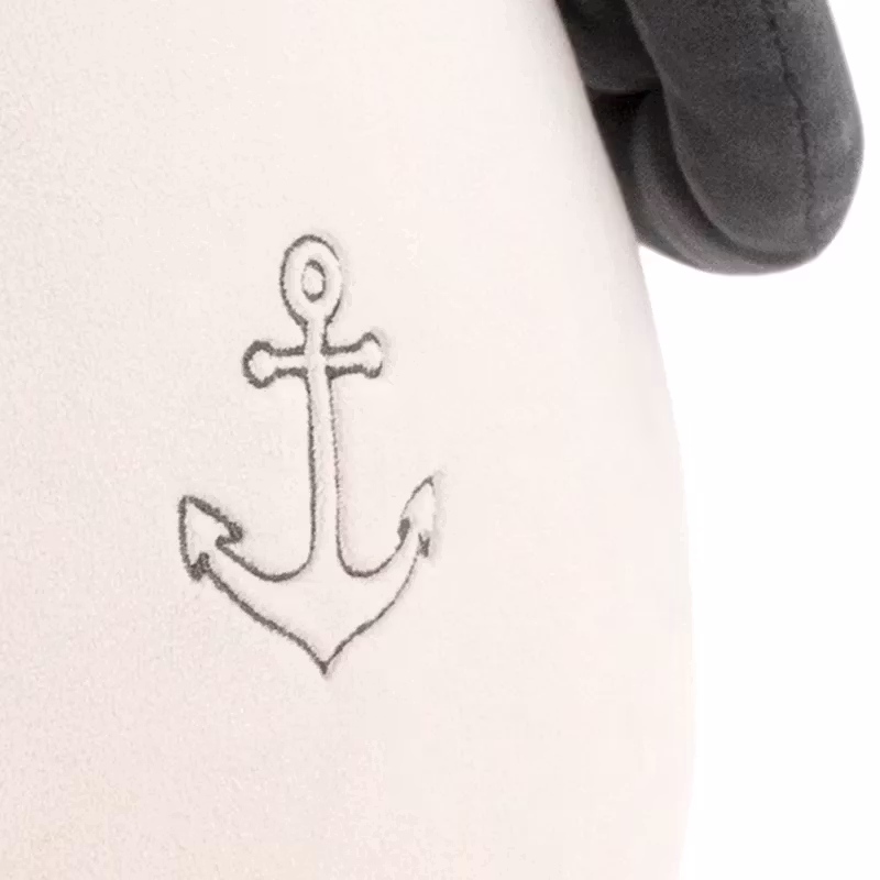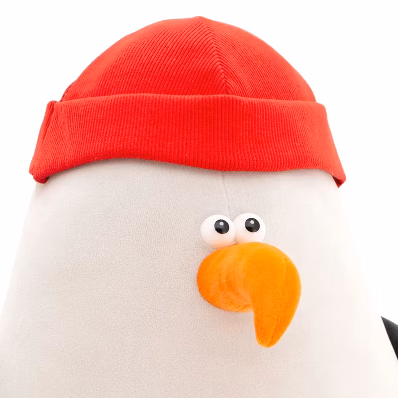En stor och gosig albatross med ett broderat ankare på magen, klädd i en röd ribbstickad mössa.
