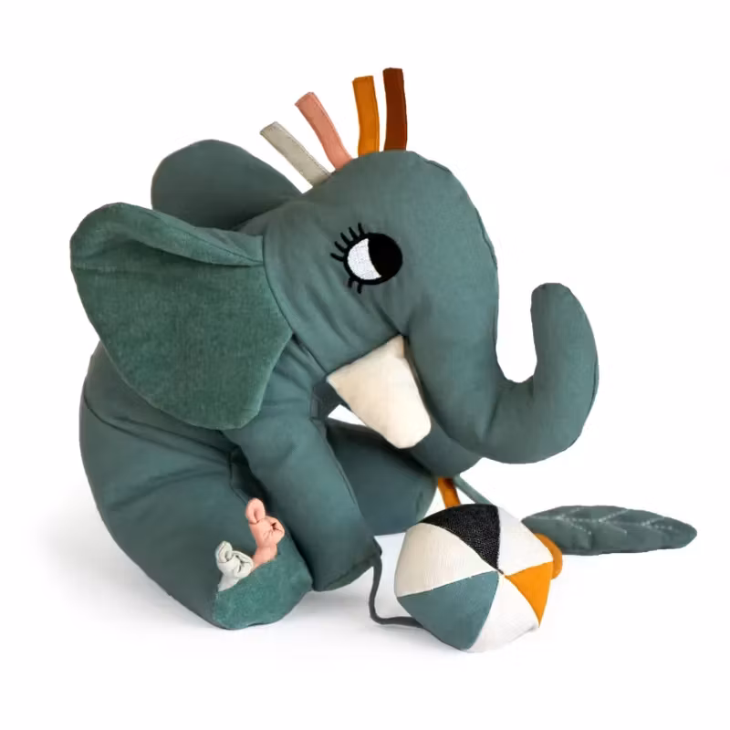 Aktivitets-elefanten är testad samt Oeko-Tex®️ certifierad och är sydd i ekologiskt bomullstyg och stoppad med polyester fiber.