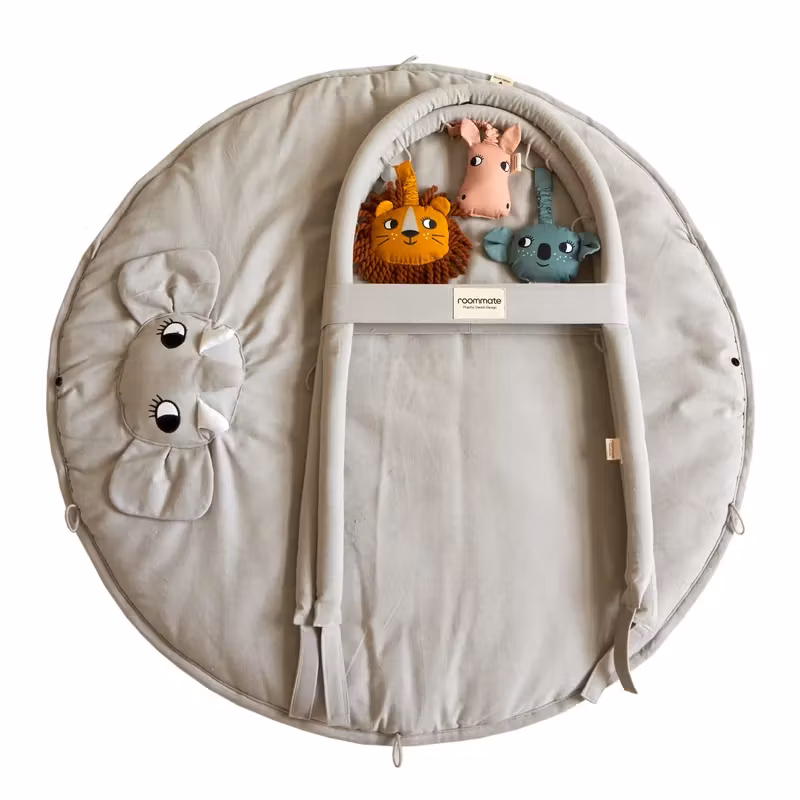 Ett snyggt , ekologiskt och kul baby gym med ett litet elefanthuvud på den stoppade grå lekmattan och tre flyttbara aktivitetsleksaker i form av huvudena från ett lejon, en koala och en flodhäst med skallror i.