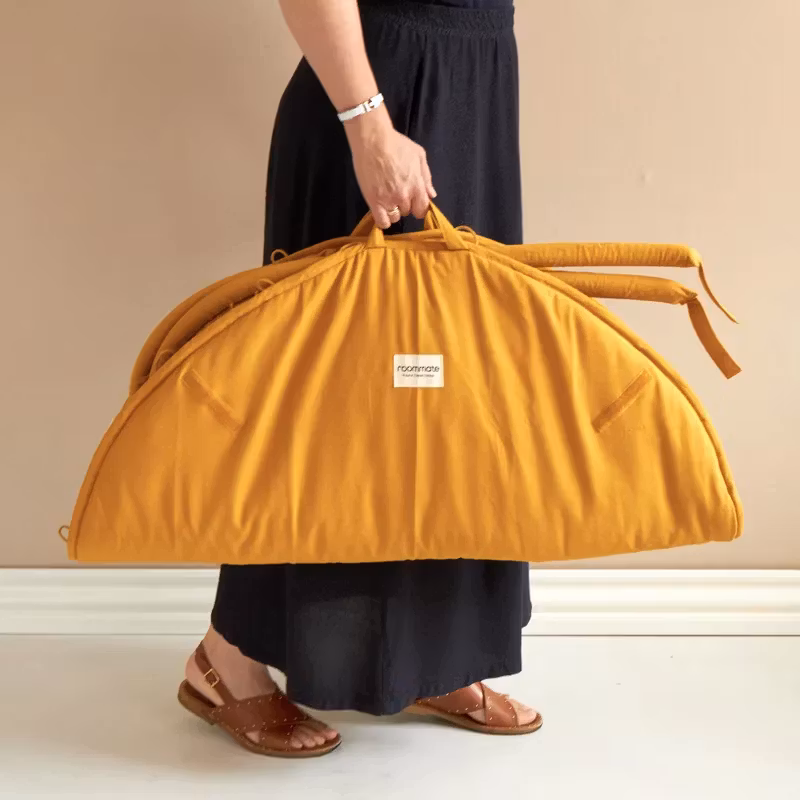 När baby gymmet inte används håller ett band av tyg ihop de båda bågarna så att de kan förvaras inuti den hopvikta lekmattan.