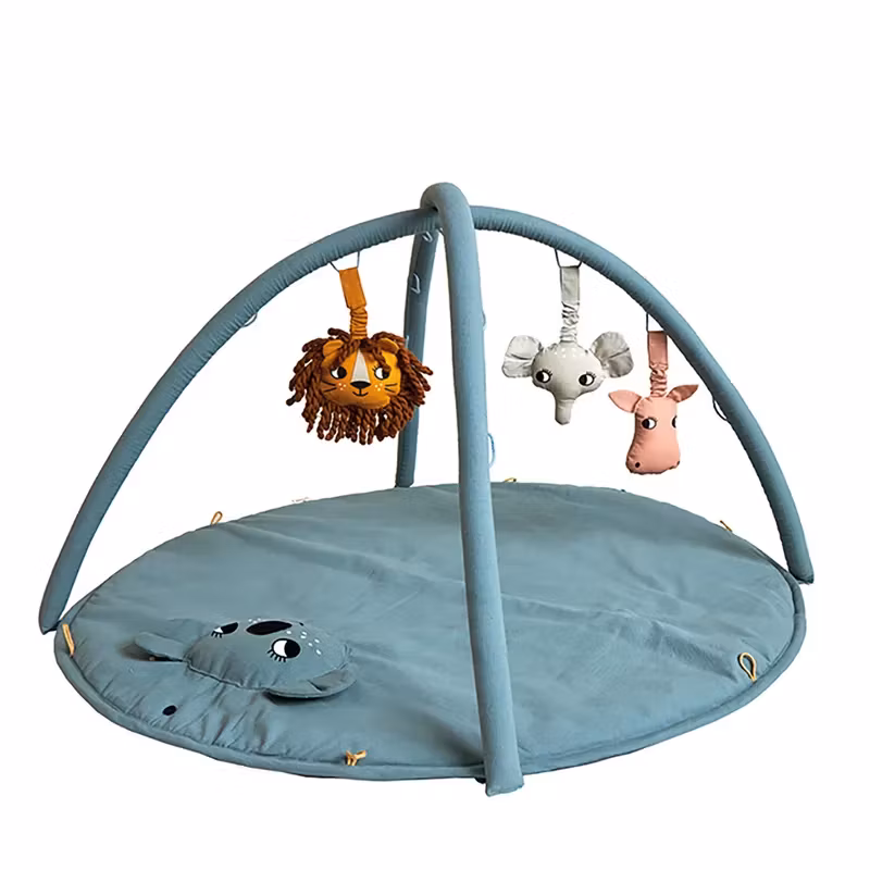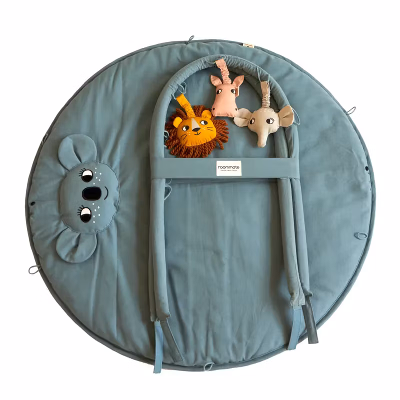 Ett snyggt , ekologiskt och kul baby gym med ett litet koala huvud på den stoppade sjögröna lekmattan och tre flyttbara aktivitetsleksaker i form av huvudena från ett lejon, en elefant och en flodhäst med skallror i.