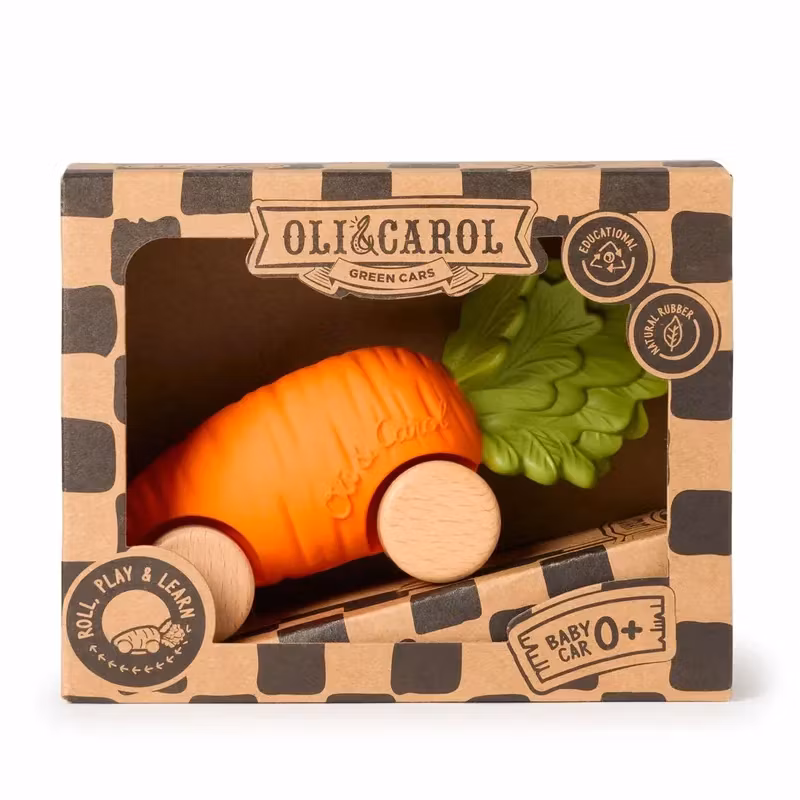 Här är Cathy, den hållbara leksaksbilen för barn! En design inspirerad av morot, handgjord med naturgummi och FSC-trä.