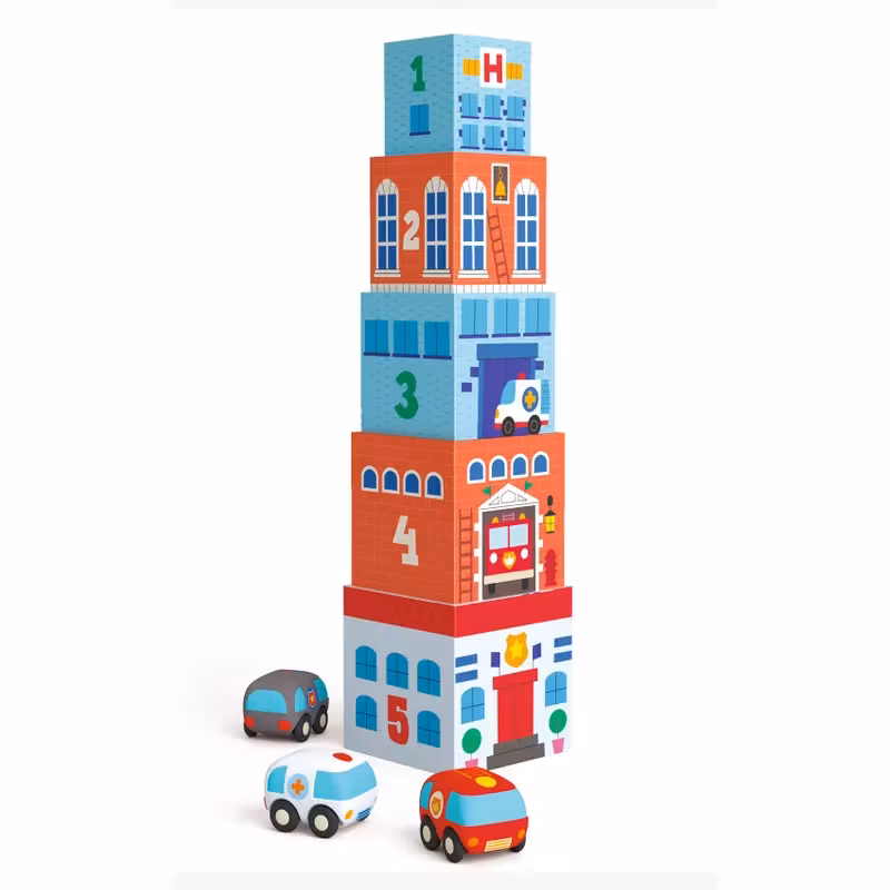 Setet består av 5 färgglada och illustrerade block som kan staplas i ett torn eller användas för att skapa en stad med en brandstation, ett sjukhus och en polisstation, tillsammans med 3 tillhörande fordon av behagligt mjuk plast som för tydlighets skull är märkta med samma färgglada symboler som de på kuberna.