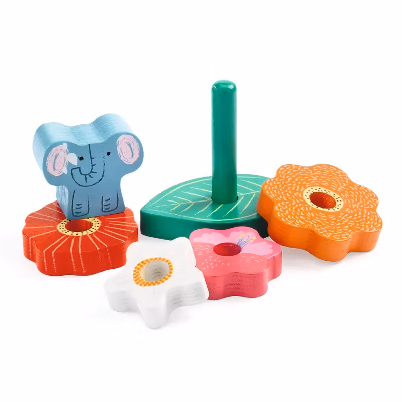 Ett enkelt reliefpussel och en stapelleksak i ett! Pusselbitarna i form av färgglada blommor och en liten elefant är lätta att greppa för små händer och tillräckligt tjocka för att kunna stå upp av sig själva och användas i andra lekar. Dessutom kan lövet bli basen för en stapelleksak där barnet trär blommorna på träpinnen och staplar dem i en snygg pyramid med den lilla elefanten på toppen.