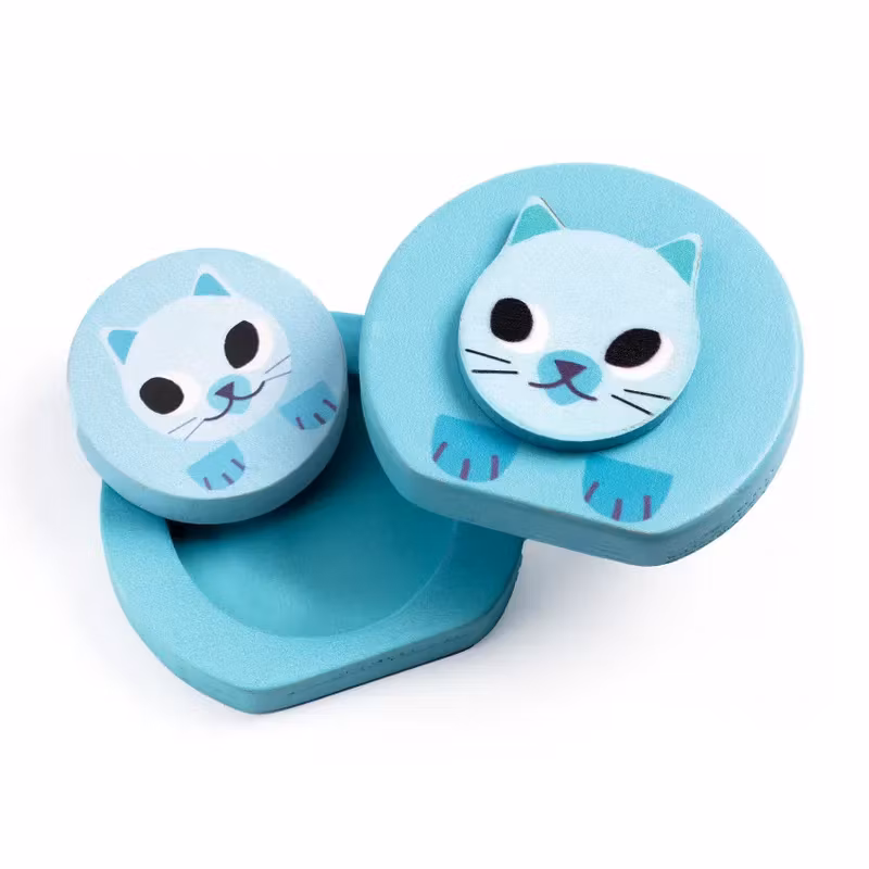 En färgglad magnetisk kurragömma-lek där fem olika djur från bondgården kan öppnas för att avslöja ett barn i samma geometriska form som föräldern, eller tvärt om.