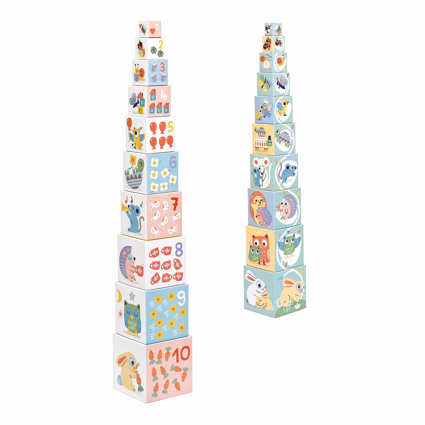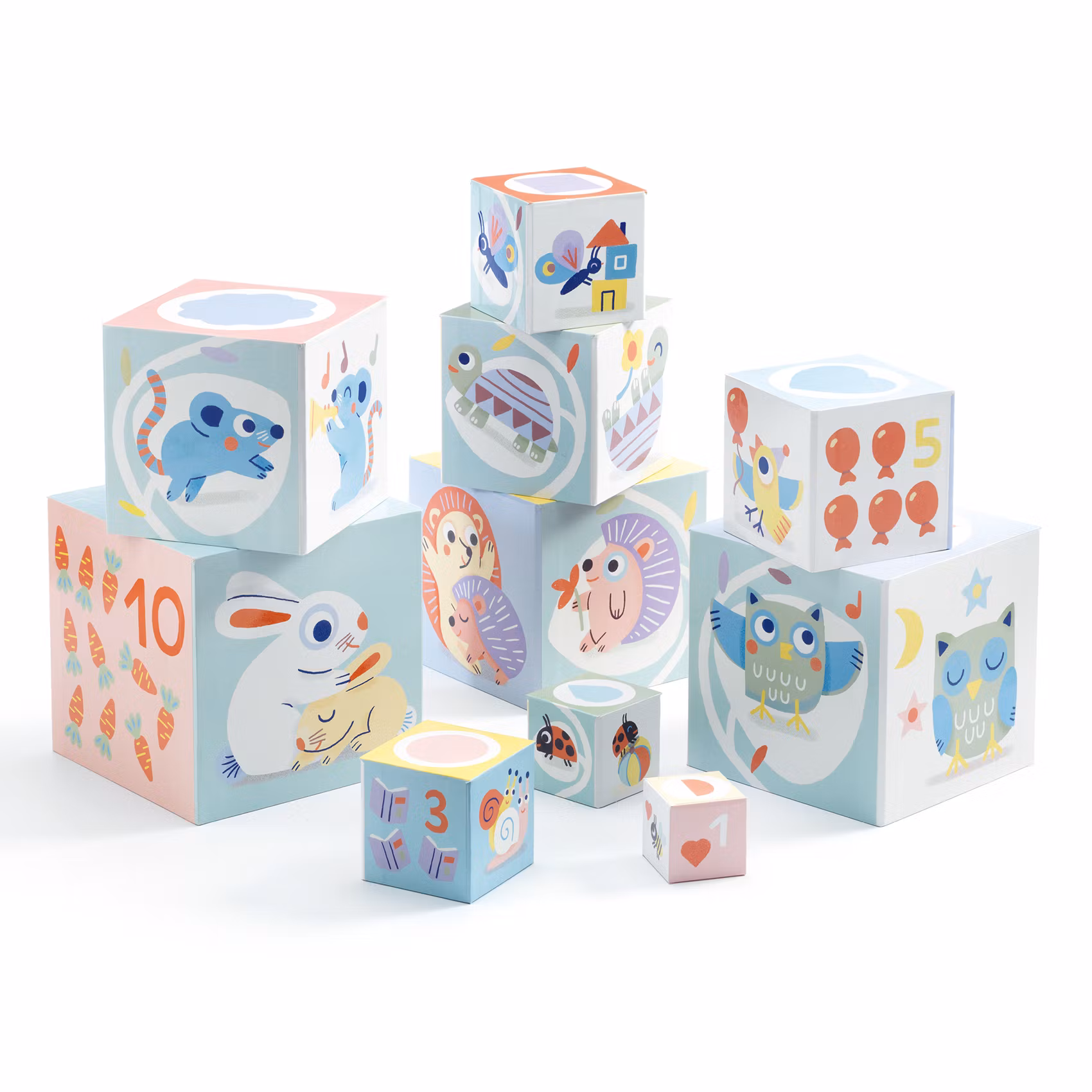 Ett set med tio fina stapelklossar i milda pastellfärger och motiv som man blir glad av och som samtidigt ger dig en ursäkt att lära ut något. Varje kloss har ett team i form av ett djur, t ex igelkott. Sidorna visar: ett glatt djur, djuret med en förälder, djuret som gör något med ett föremål, och en sida med en siffra som också illustreras med samma antal föremål. Överst på varje kloss finns någon typ av geometrisk figur. Klossarna är tillverkade i hållbar och kraftig papp och en sida på klossen är öppen så man kan stapla dem i varandra för kompakt förvaring i den medföljande lådan. Tillsammans bildar klossarna en 86 cm hög stapel.