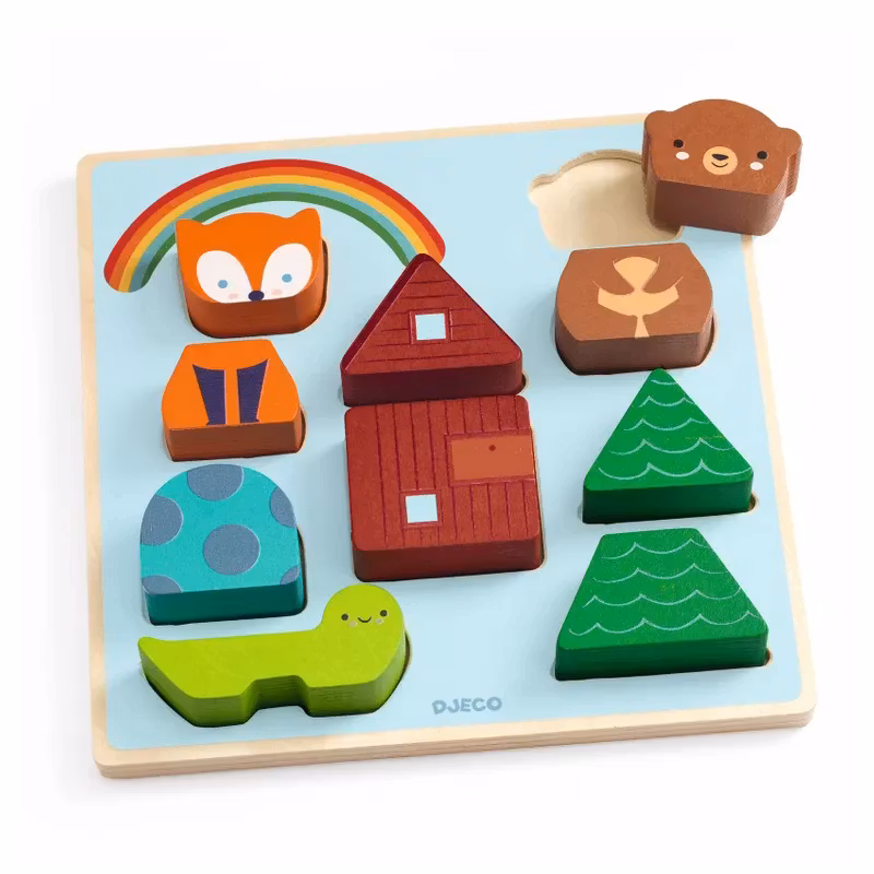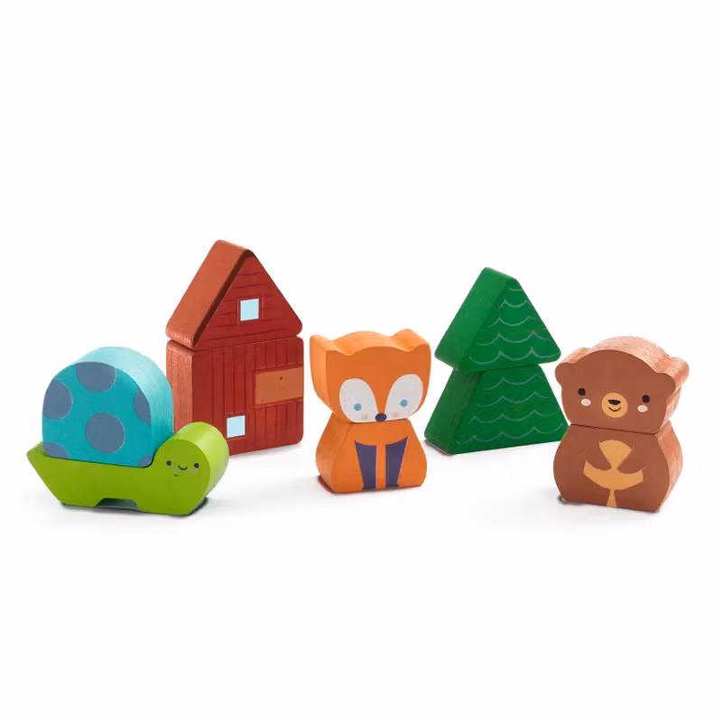Dessutom är pusselbitarna tillräckligt tjocka för att kunna stå upp av sig själva och när de staplas i sina par bildar de en räv, ett hus, en björn, en sköldpadda och en gran.