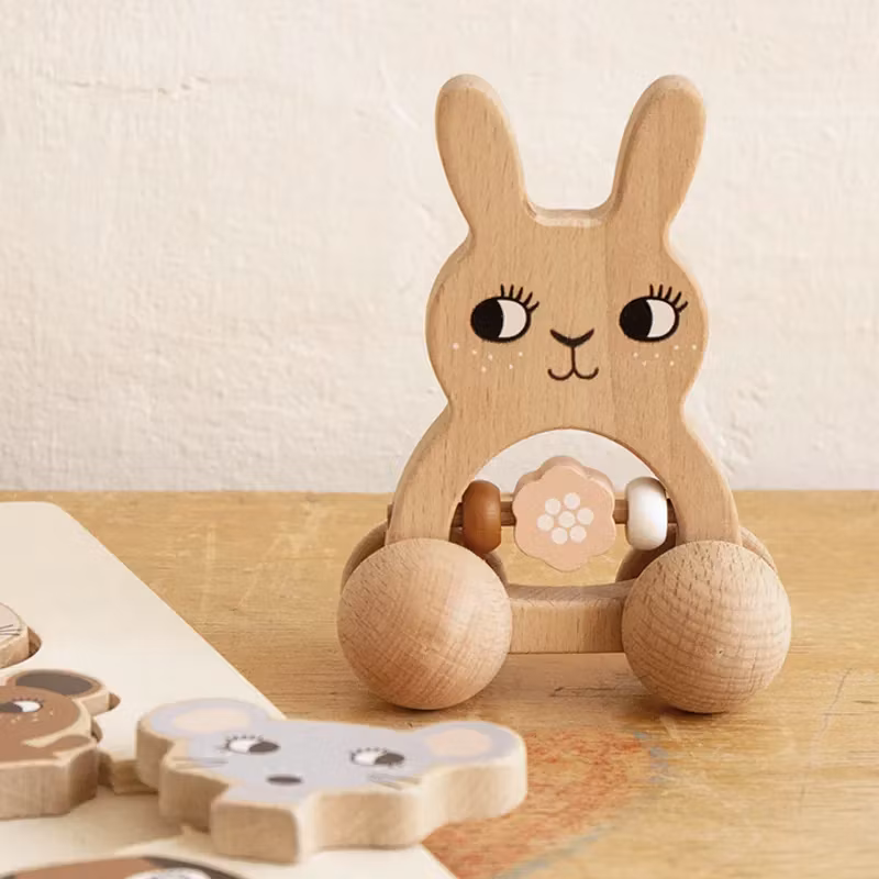 En rolig träleksak i form av en kanin med inbyggd skallra som kan rullas omkring på sina fyra hjul.