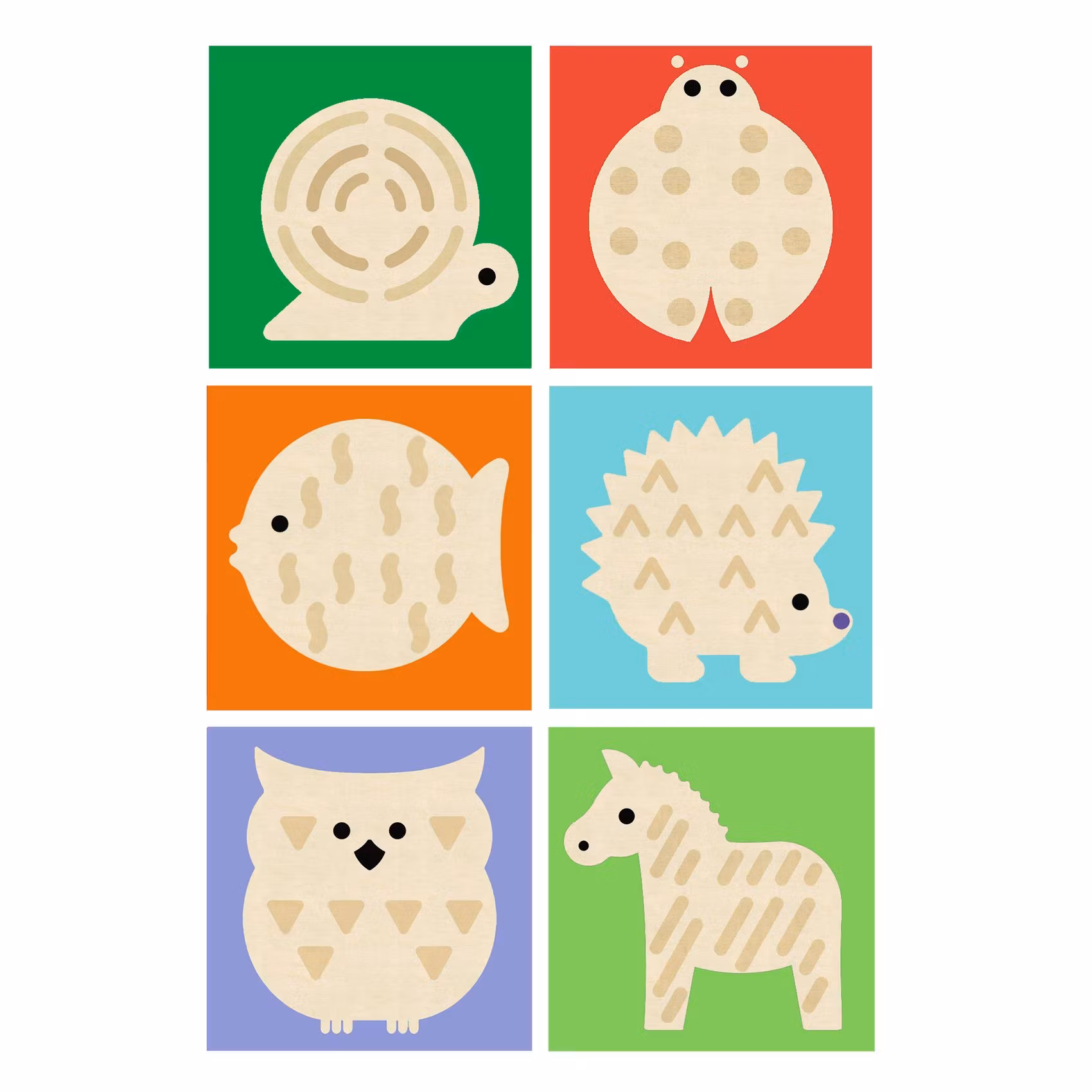 Innehåll: 4 graverade och illustrerade träkuber som bildar sex motiv (snigel, nyckelpiga, fisk, igelkott, uggla och häst).