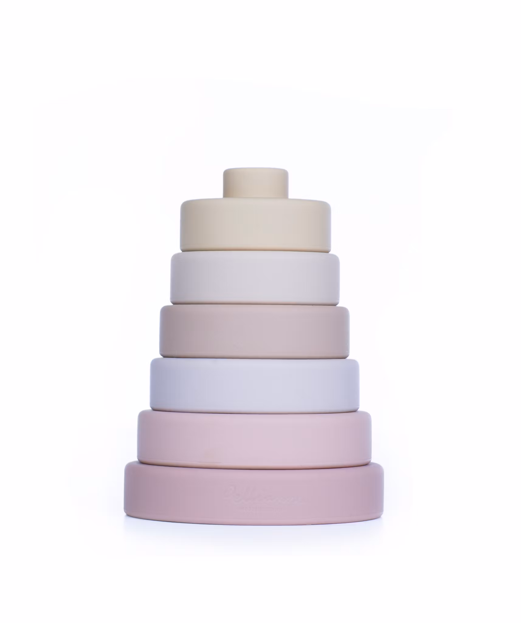 En snygg stapelleksak av silikon i olika rosa nyanser. De 6 delarna har upphöjda cirklar i mitten som hakar i delen som läggs ovanpå.