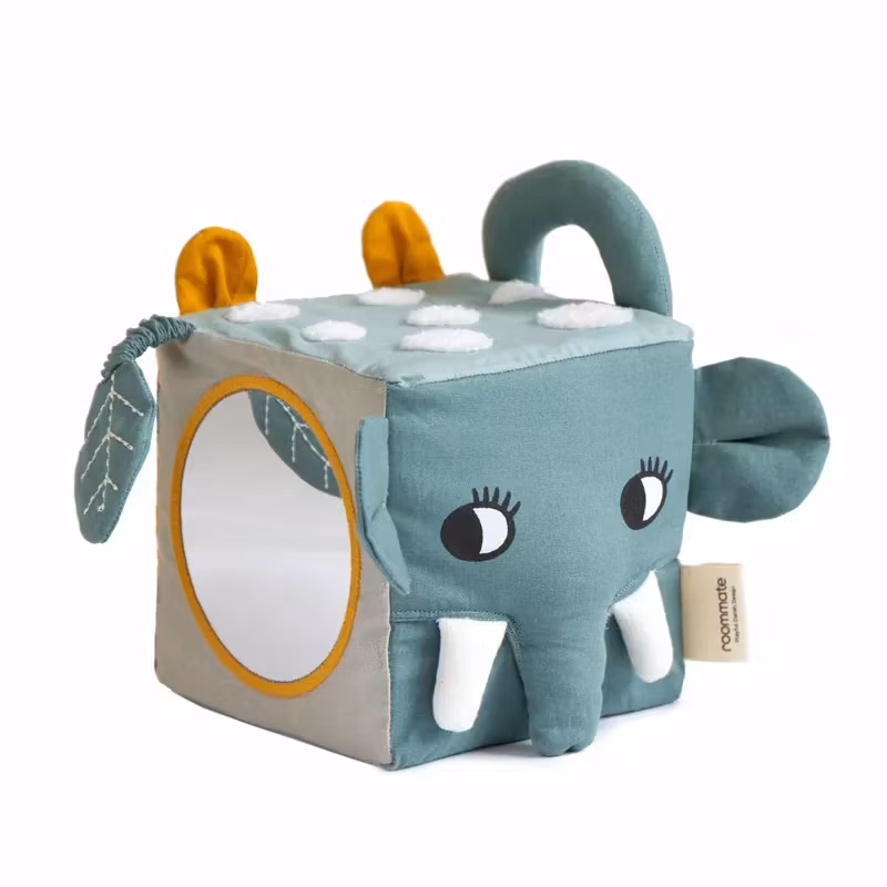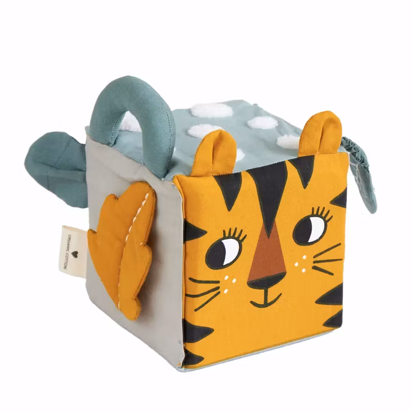 En snygg och rolig ekologisk aktivitetskub med djungeldjur som tema som erbjuder bebisen många olika saker att känna och titta på, bland annat en liten rund spegel, upphöjda strukturer och prasslande ljud.