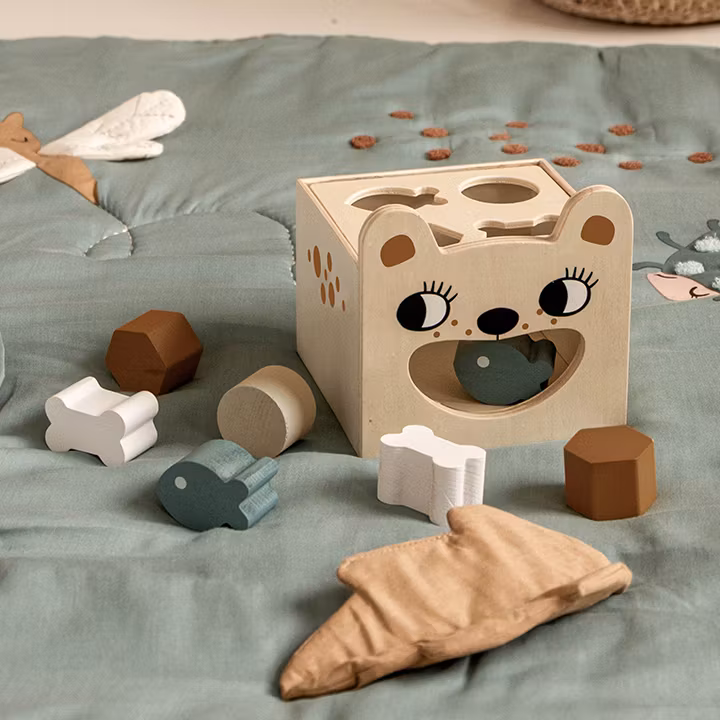 En snygg sorteringsbox av björkträ, dekorerad som en björn och med fyra olika former på klossarna: runda, sexkantiga, fisk och ben.