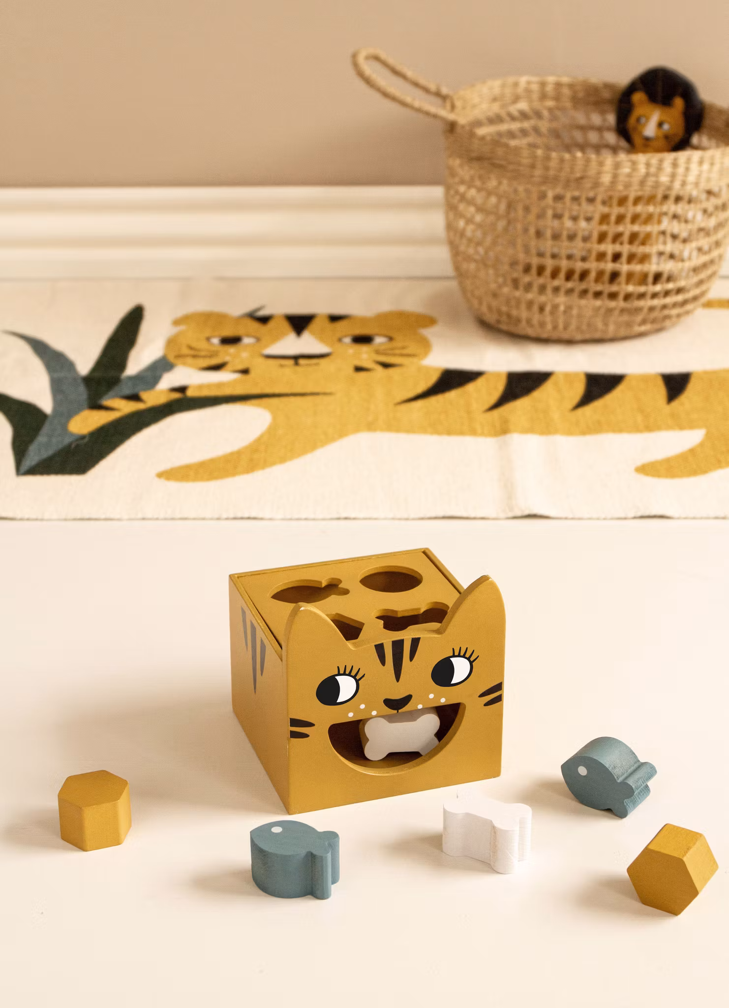 En snygg sorteringsbox av björk trä, dekorerad som en tiger och med fyra olika former på klossarna: runda, sexkantiga, fisk och ben.