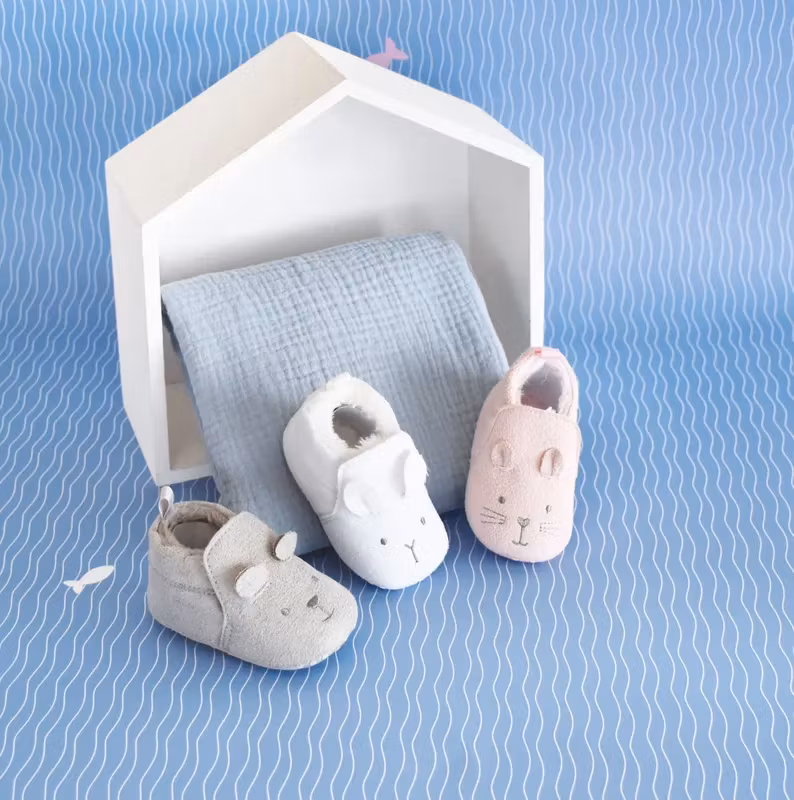 Tofflornas undersidor har en knottrig beläggning som gör att bebisen inte halkar.