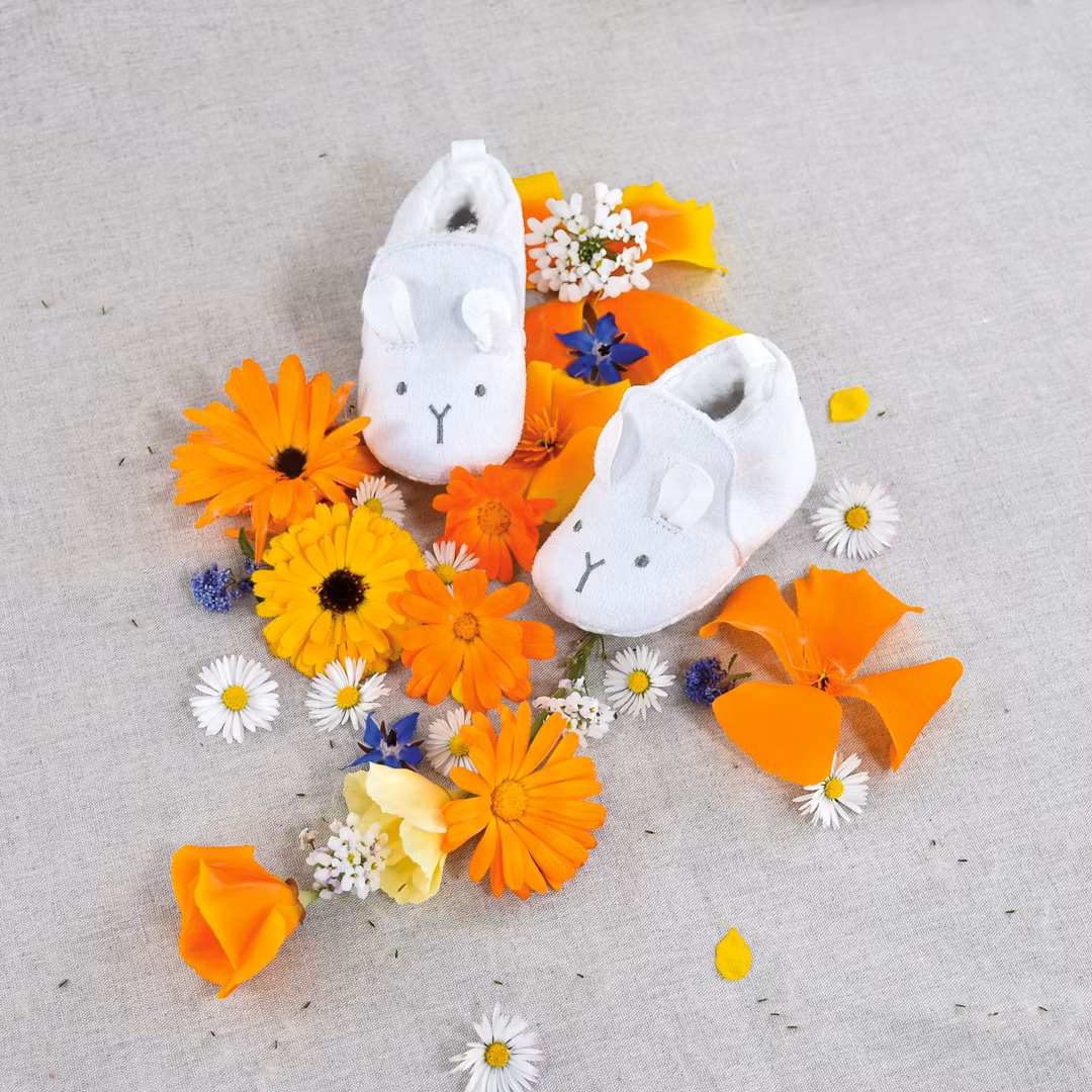 Små bebistofflor fodrade med fluffig plysch samt dekorerade som vita kaniner. Tofflornas undersidor har en knottrig beläggning som gör att bebisen inte halkar.