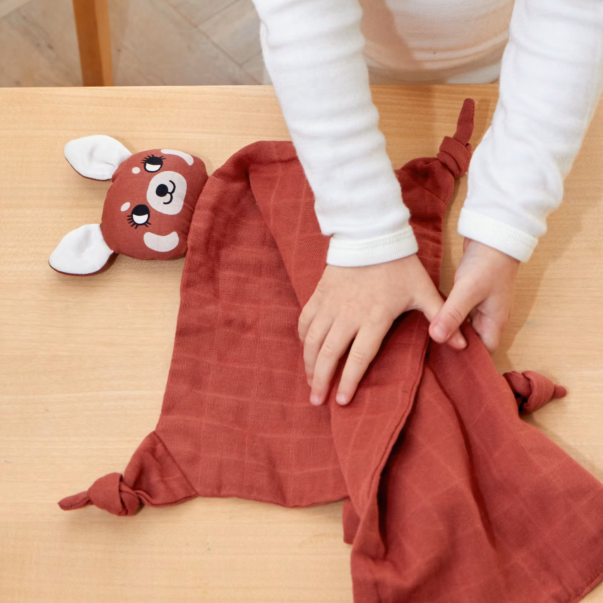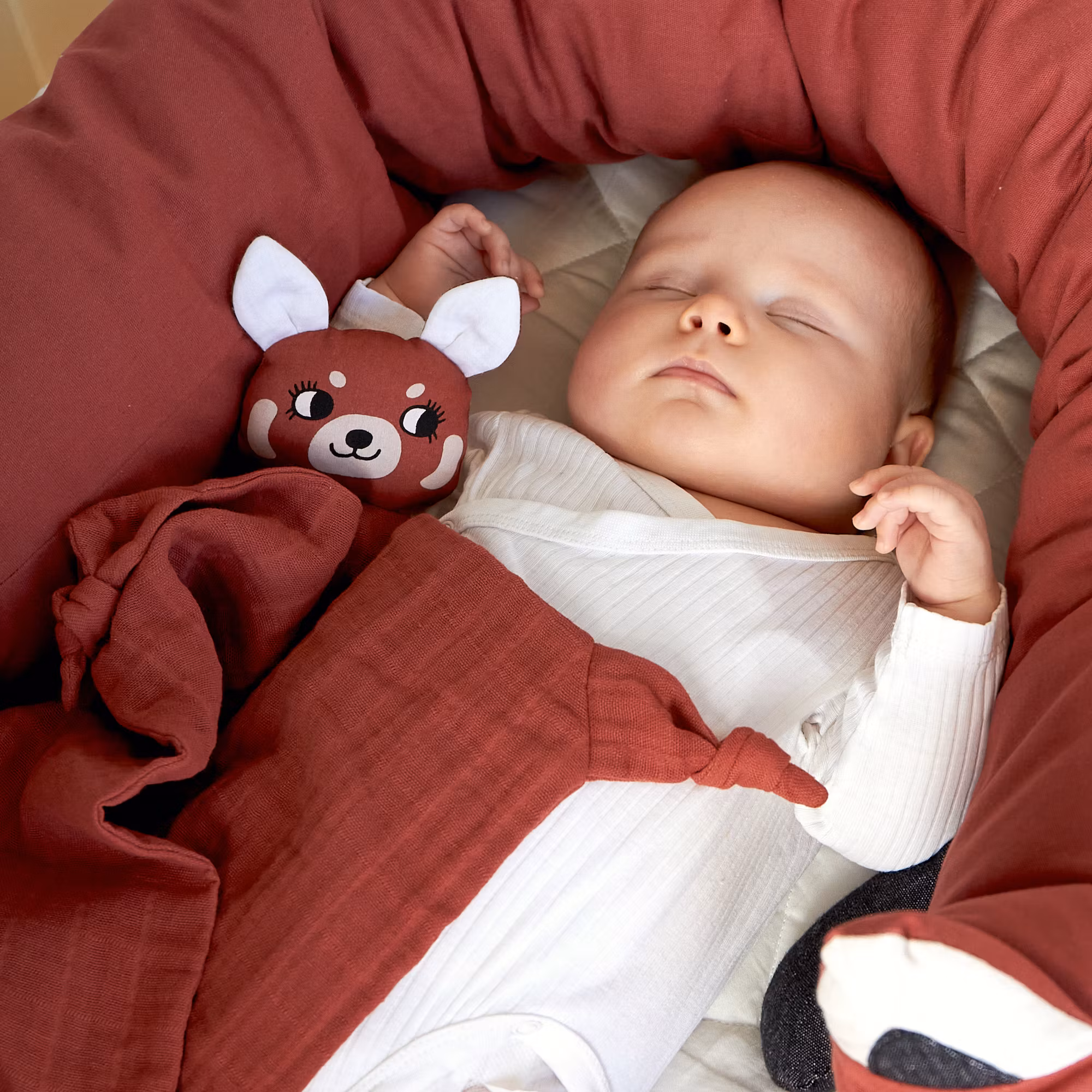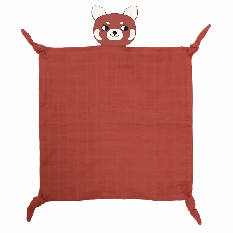 En snygg och söt ekologisk snuttefilt i mörkrött, designad som en röd panda med ett gosigt huvud och knutar i alla fyra hörnen.