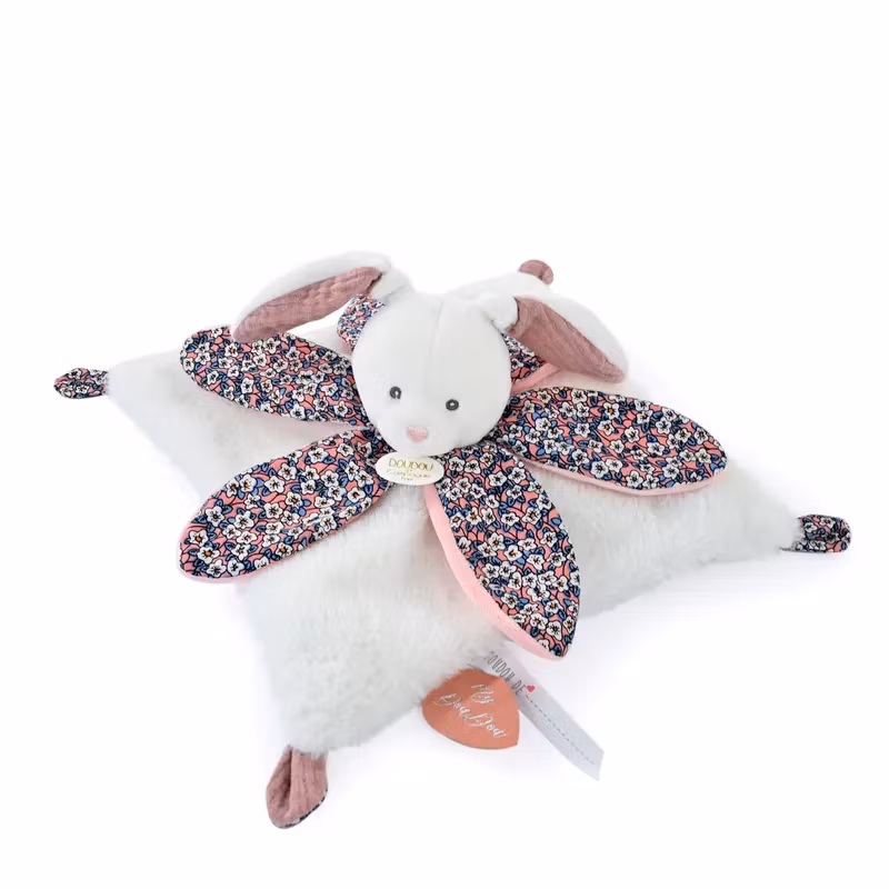 En fantastiskt mjuk snuttefilt prydd med ett bedårande vitt kaninhuvud mitt på, omringat av kronblad i ett vackert mönstrat tyg.