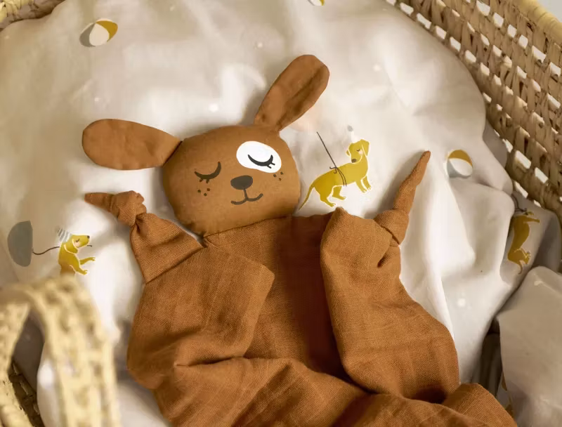En snygg och söt ekologisk snuttefilt i brunt med ett stoppat hundhuvud och knutar i alla fyra hörnen.