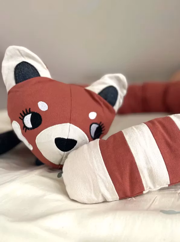 En charmig, mjuk, Oeko-Tex®️ certifierad och riktigt lång Röd panda i mörkröd ekologisk bomull med två små ben i var ände, en randig svans samt ett snyggt huvud med broderade och applicerade detaljer samt spetsade öron.