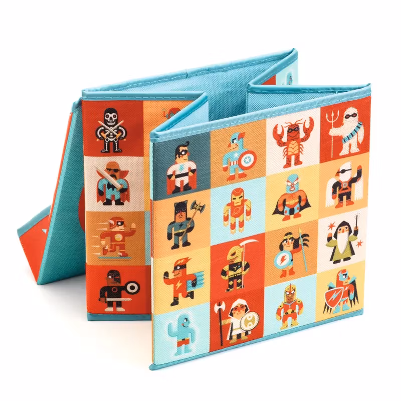 En snygg och charmig leksakslåda som också kan användas som pall, dekorerad med coola illustrationer av bland annat stjärnor och olika hjältemodiga figurer.
