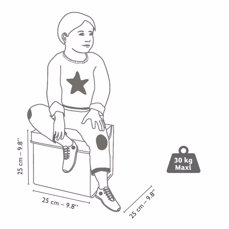 Denna dekorativa förvaringslösning är ett perfekt hjälpmedel för att hålla ordning på leksakerna, och tack vare sin robusta trästomme kan lådan dessutom användas som sittplats för barn upp till 30 kg, vilket motsvarar ungefär 9 års ålder.