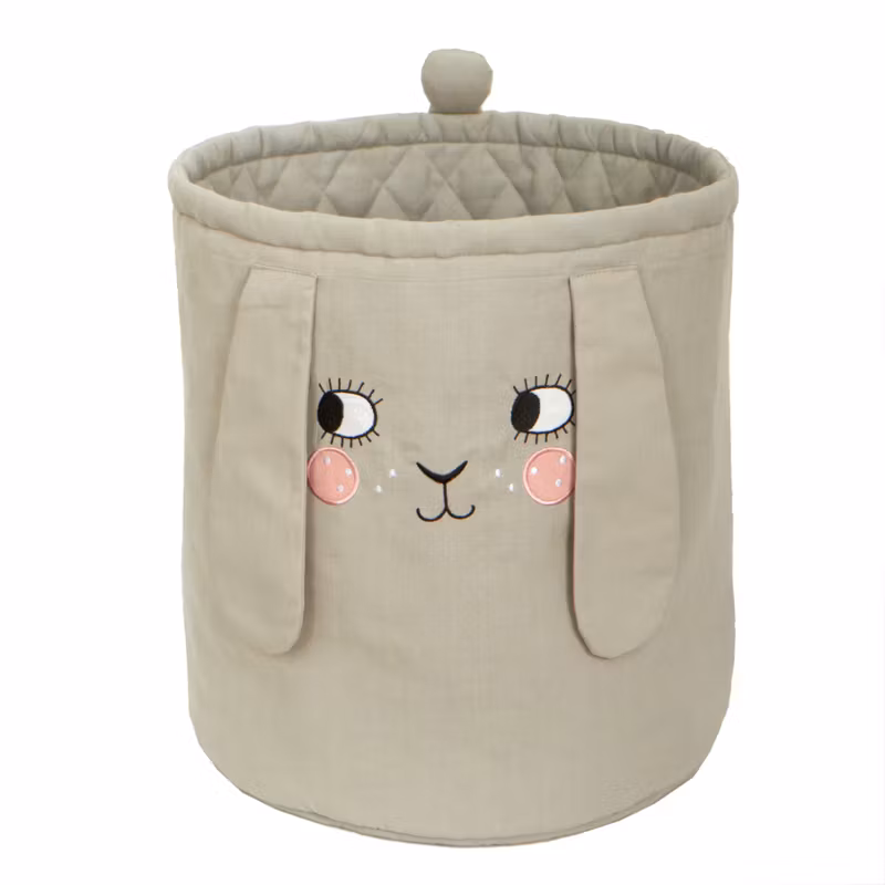 Charmig förvaringskorg för tvätt eller leksaker. Utformad som en söt kanin. Sydd i ekologisk bomull och stoppad med polyester fiber. (Oeko-Tex Standard 100). Broderad design.