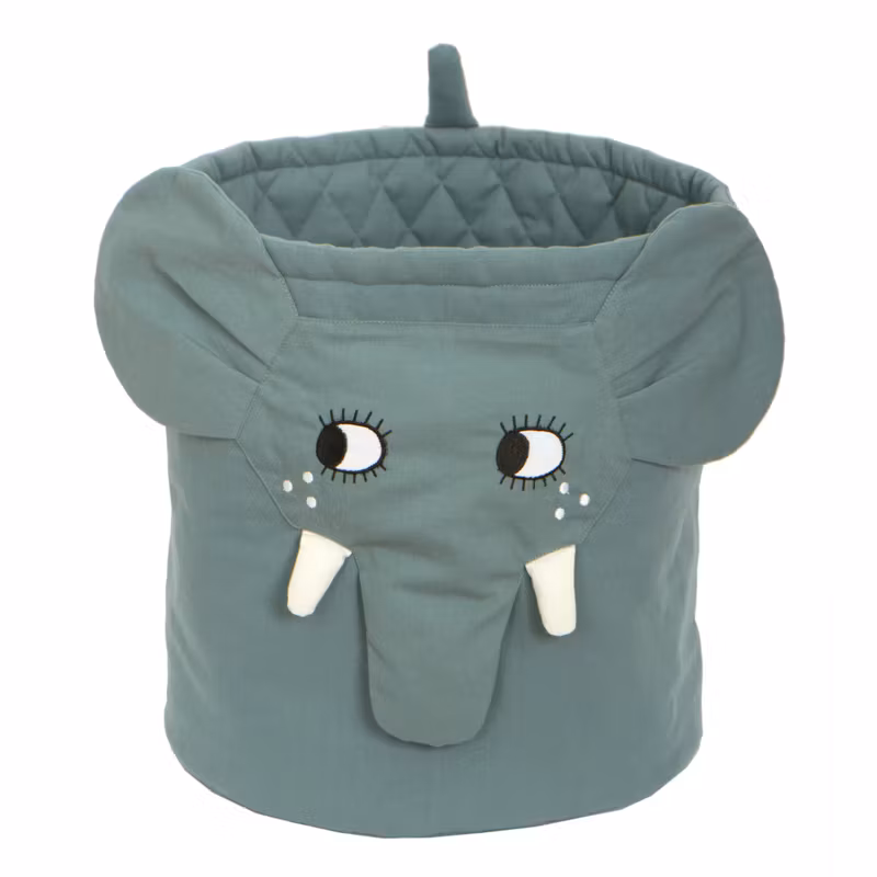 Charmig förvaringskorg för tvätt eller leksaker. Utformad som en gullig elefant med betar och snabel. Sydd i ekologisk bomull och stoppad med polyester fiber. (Oeko-Tex Standard 100). Broderad design.